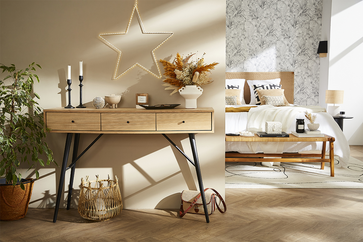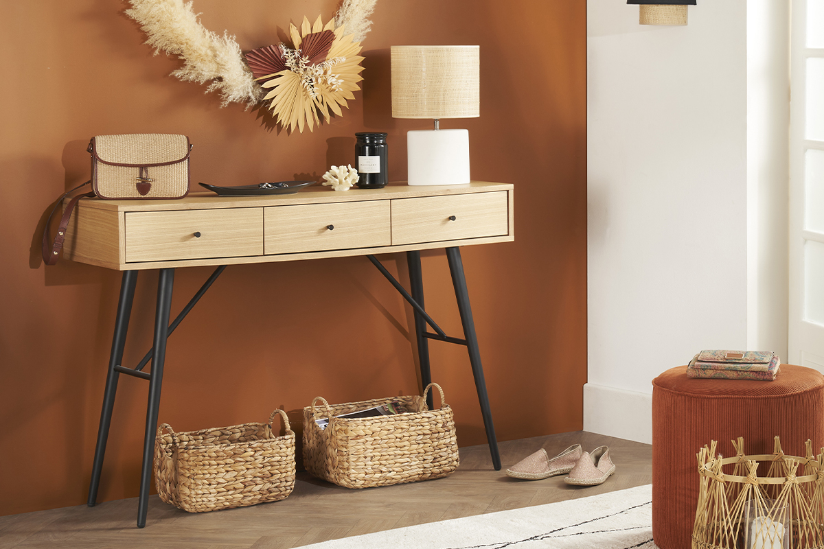 Astuce déco : pour une atmosphère intimiste décorez votre console d'une lampe à poser avec détails noirs ou aux teintes naturelles.