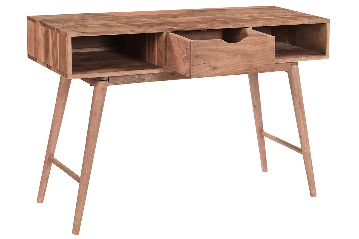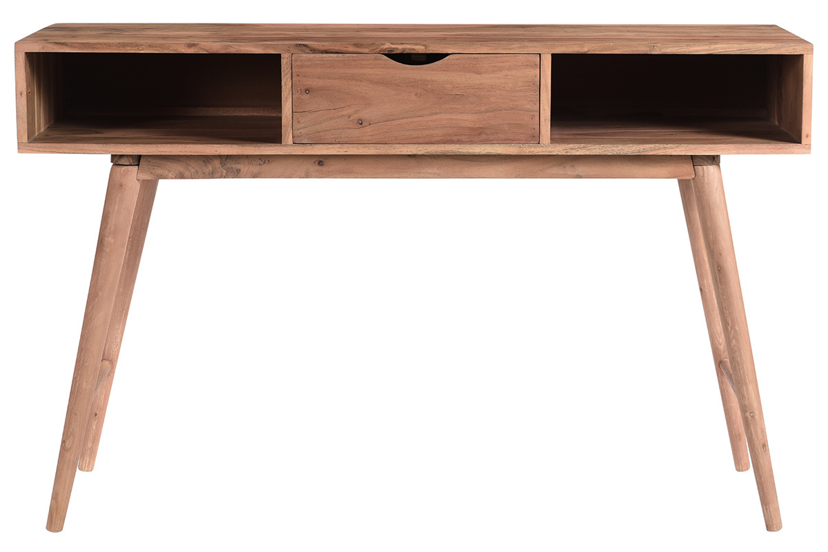 Parfaitement adaptée aux petits espaces, cette console en bois massif est équipée de deux niches ouvertes et d'un tiroir pour organiser les affaires du quotidien.