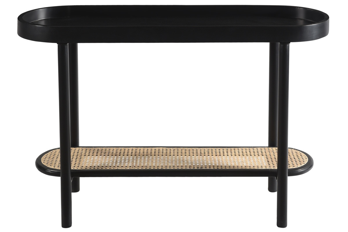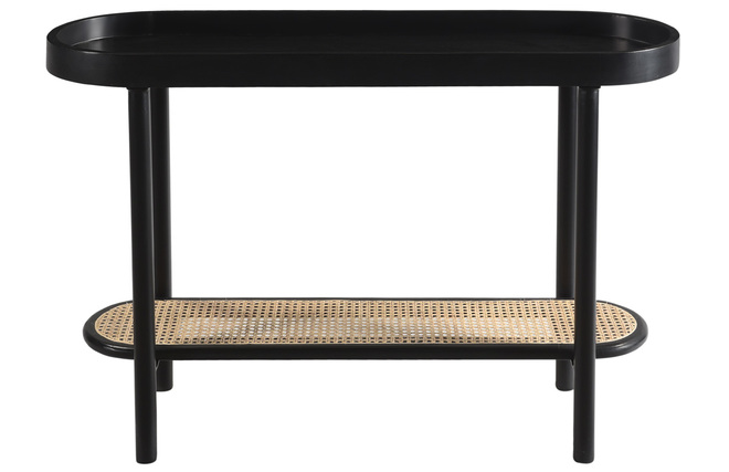 Sobre et élégante, la structure en acacia massif teinté noir est sublimée par des finitions toutes en rondeur. Empreint de poésie, le cannage de rotin blond, pare la tablette sous-jacente (L104 x L24 x H18 cm) de ses doux entrelacs. L'ensemble contraste pour un résultat ultra tendance qui apportera du caractère à votre intérieur ! Loin des standards, unique et riche de sa propre histoire, ce meuble est fabriqué à la main. Au charme authentique, cette console noire et cannage séduira inévitablement les aficionados des styles rétro, bohème ou ethnique chic.