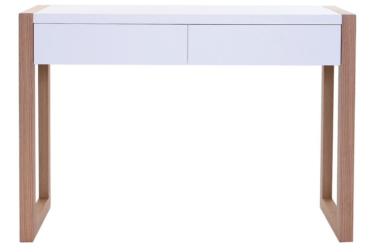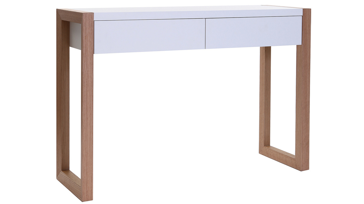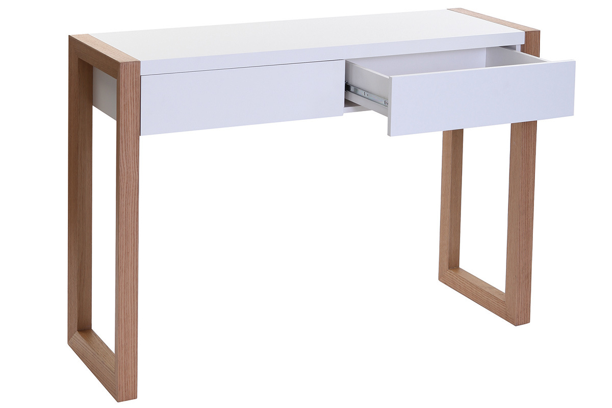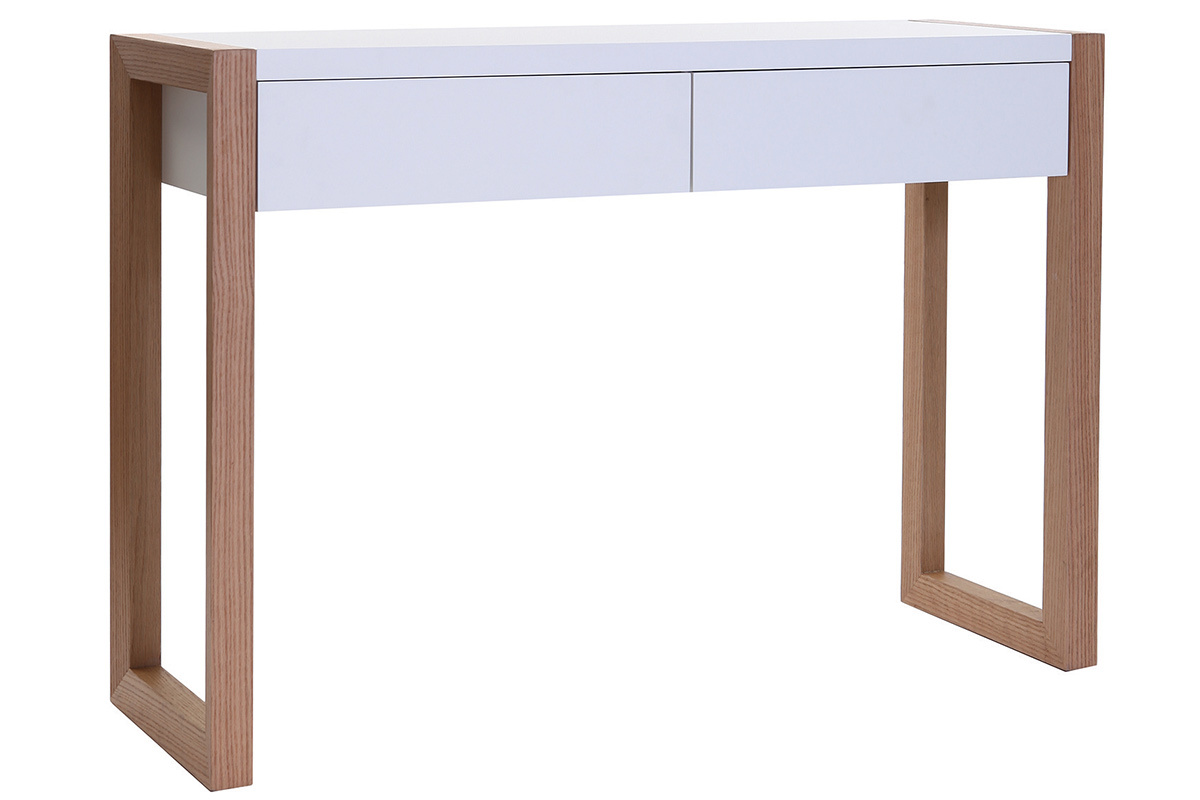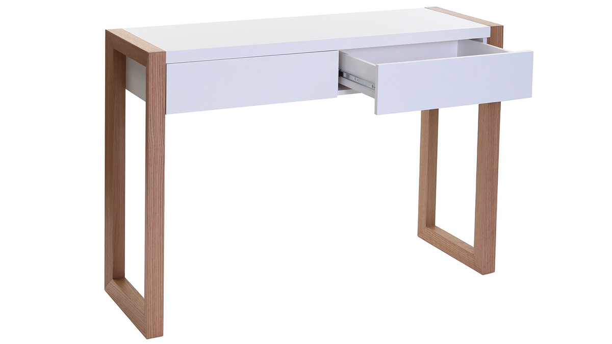 Aux dimensions L120 x P40 x H83 cm, cette grande console blanche et bois clair bénéficie d'un look des plus aériens grâce au piètement placage chêne qui cadre et supporte un caisson en panneaux de fibres de bois mélaminé blanc mat. Très pratique, cette console avec rangements est équipée de deux tiroirs dans lesquels vous pourrez ranger tous les petits objets du quotidien.