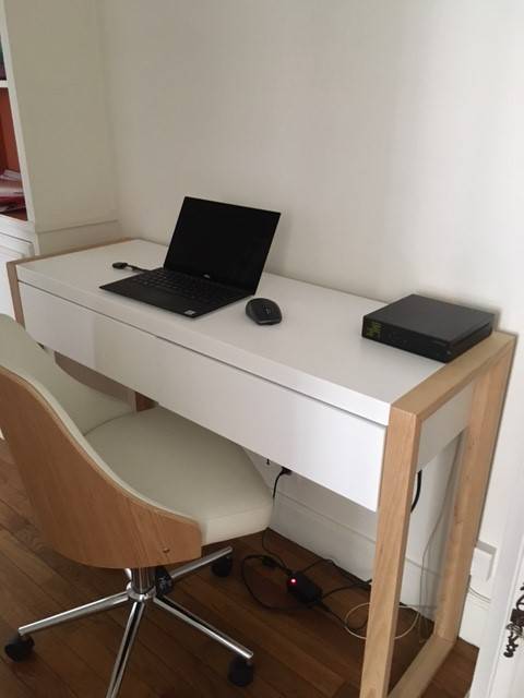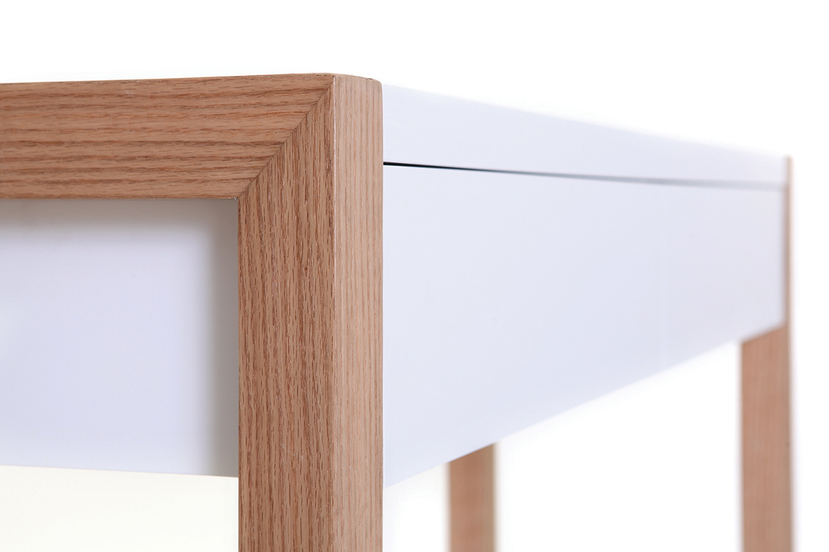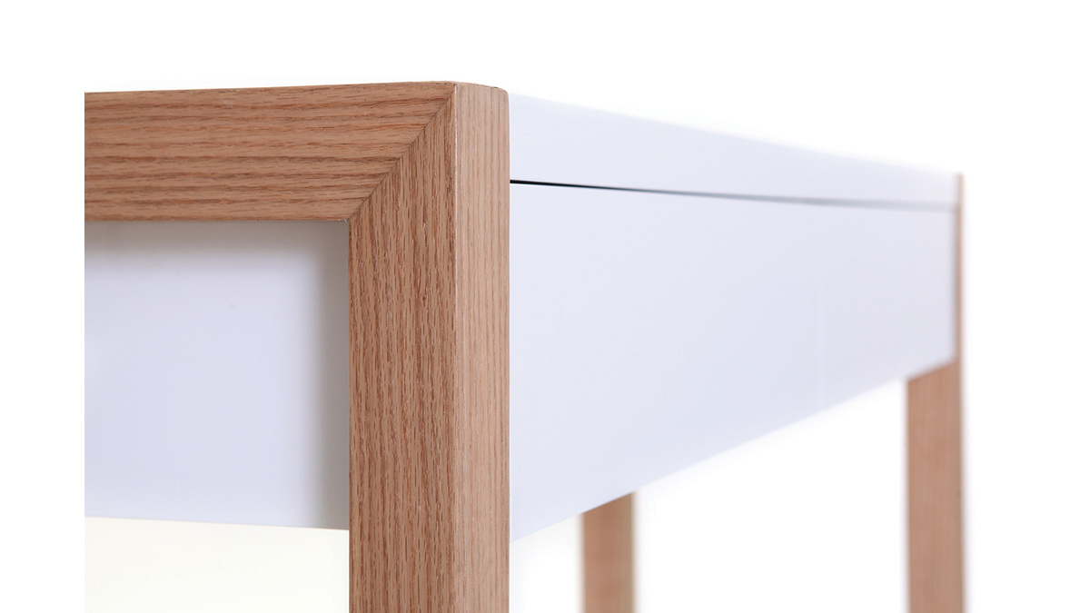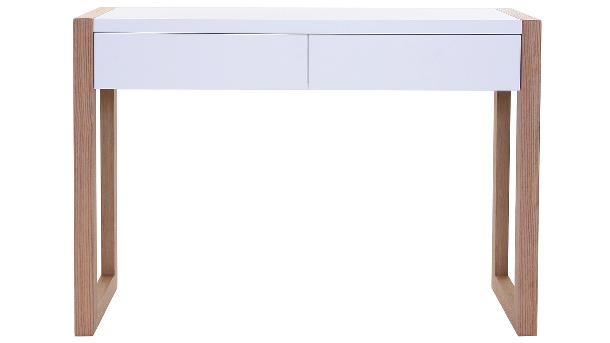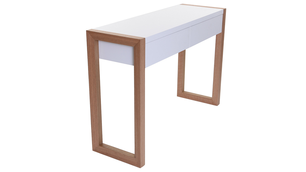 Aux dimensions L120 x P40 x H83 cm, cette grande console blanche et bois clair bénéficie d'un look des plus aériens grâce au piètement placage chêne qui cadre et supporte un caisson en panneaux de fibres de bois mélaminé blanc mat. Très pratique, cette console avec rangements est équipée de deux tiroirs dans lesquels vous pourrez ranger tous les petits objets du quotidien.