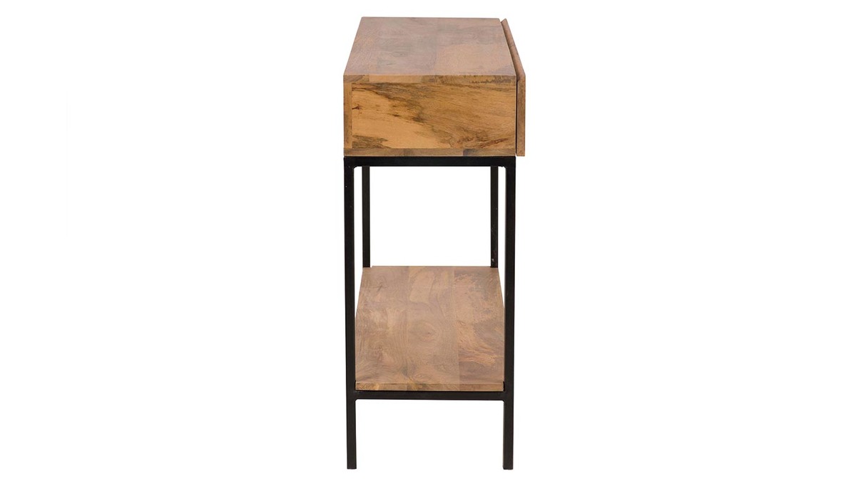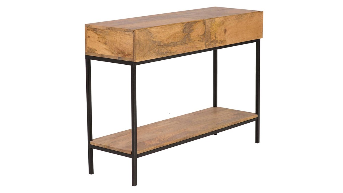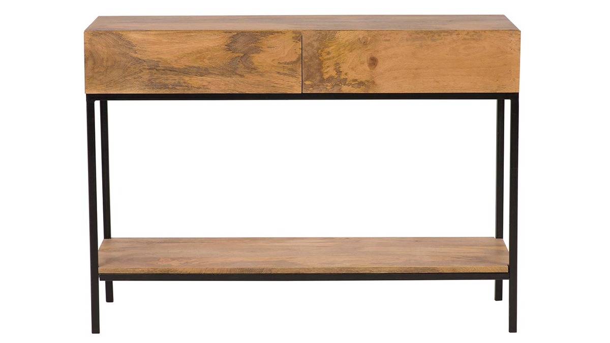 Console industrielle avec rangements 2 tiroirs en bois manguier massif et métal noir L110 cm YPSTER à assembler.