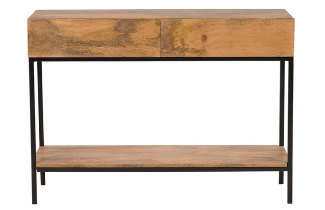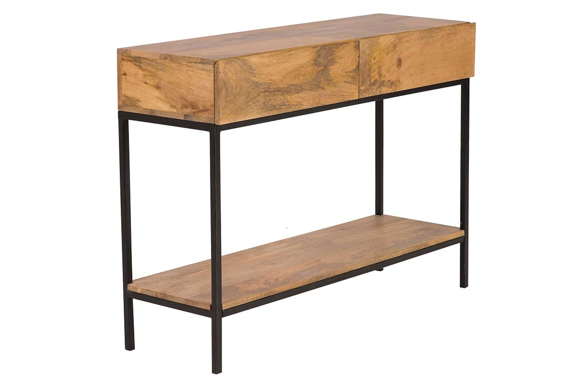Cette console industrielle conçue en manguier massif dispose de finitions exemplaires. Piètement en métal et structure en bois massif, l'harmonie est parfaite entre les deux matériaux. Un mariage de matières et couleurs qui offre un rendu final magnifique ! Facile d'entretien, une couche de vernis a été appliquée dans le but de protéger ce meuble. Équipée de 2 tiroirs et d'un plateau inférieur, cette console avec rangements pourra aisément être placée dans votre hall d'entrée pour accueillir vos clés, votre sac à main, votre courrier...