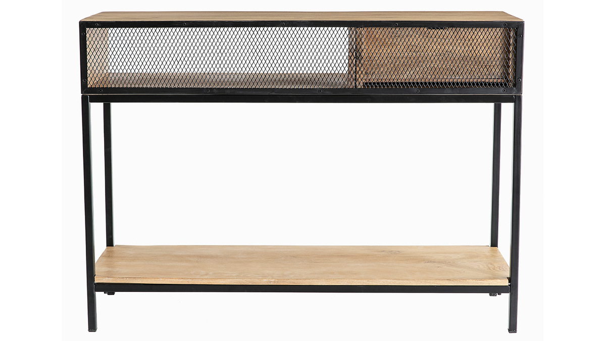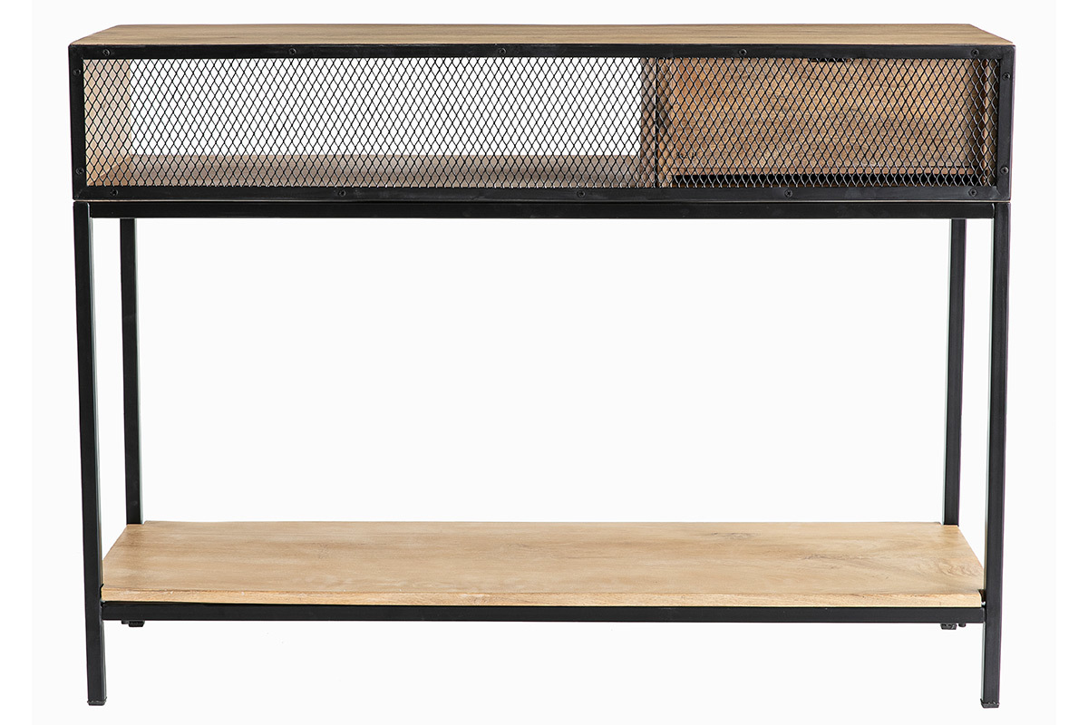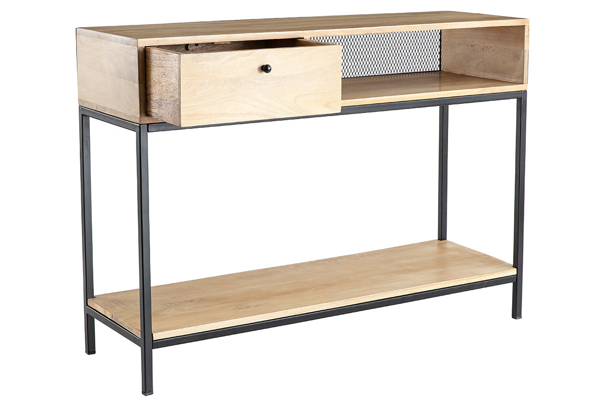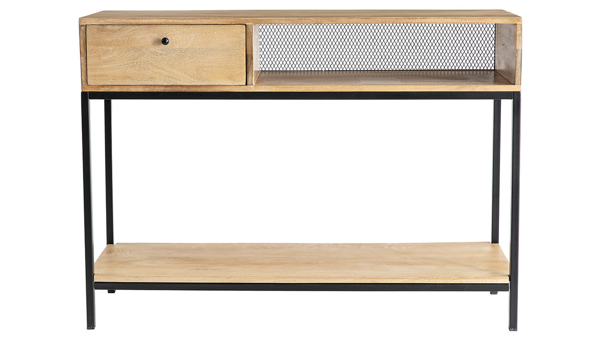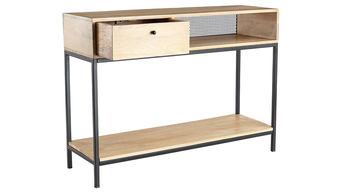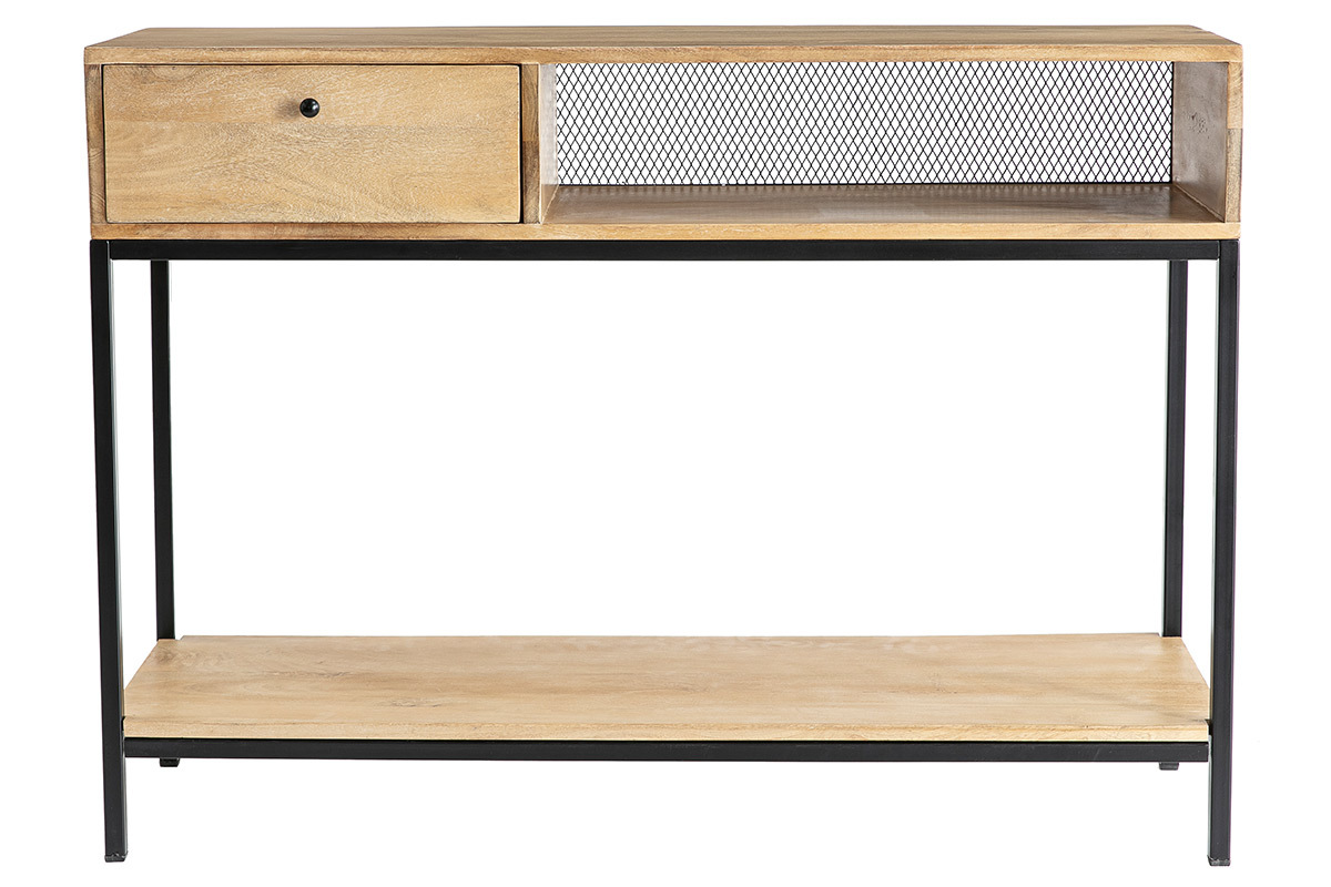 Cette console en bois et métal avec rangements est un meuble multifonction. Dans une entrée ou un séjour, on pourra profiter de son grand plateau supérieur pour déposer un vide-poche et des éléments de décoration comme une lampe à poser design. Son tiroir et sa niche ouverte permettent d'organiser tout les affaires du quotidien. Des chaussures ou des paniers déco trouveront leur place sur son plateau inférieur. Grâce à ses dimensions L110 x P35 x H80 cm et ses nombreux rangements, cette grande console en bois et métal pourra également être utilisée comme desserte de cuisine, en prenant soin de la protéger.