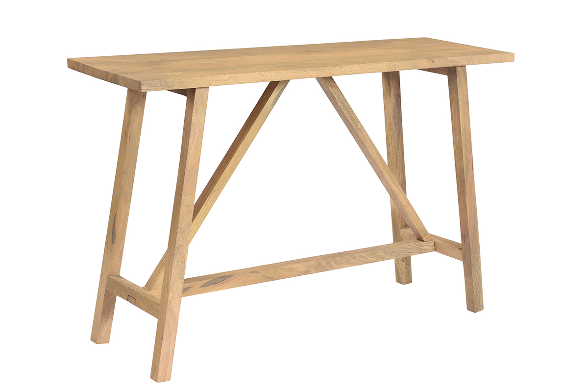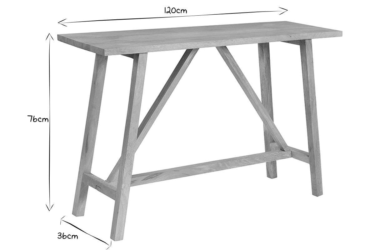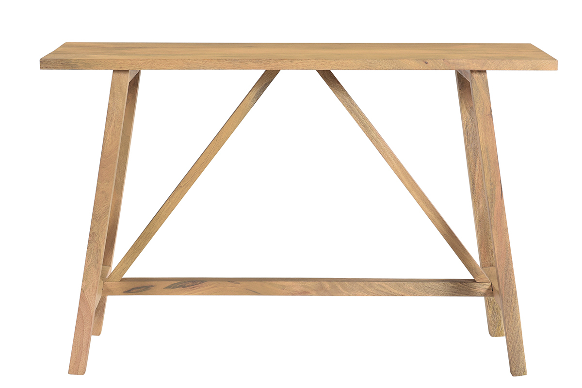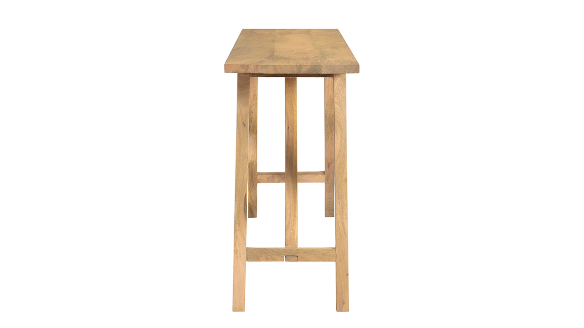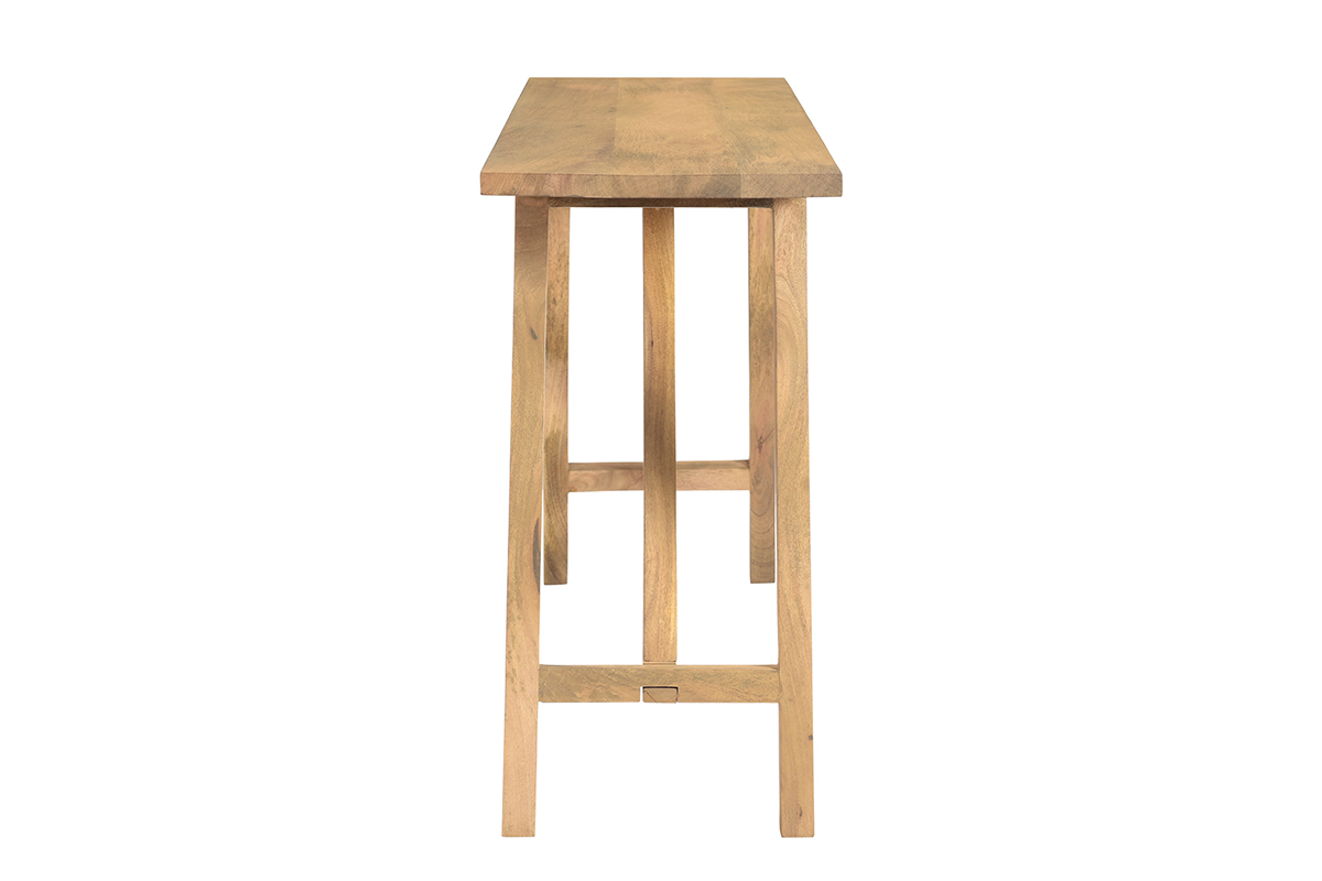 Grâce à ses dimensions (L120 x P36 x H76 cm), cette grande console en bois clair trouve sa place aussi bien dans une pièce à vivre que dans une entrée ou une chambre. Le plateau est idéal pour y déposer des éléments qui sublimeront la déco intérieure. On opte par exemple pour des accessoires en fibres naturelles qui se marieront très bien avec le manguier massif ou encore une lampe à poser design au charme ethnique !