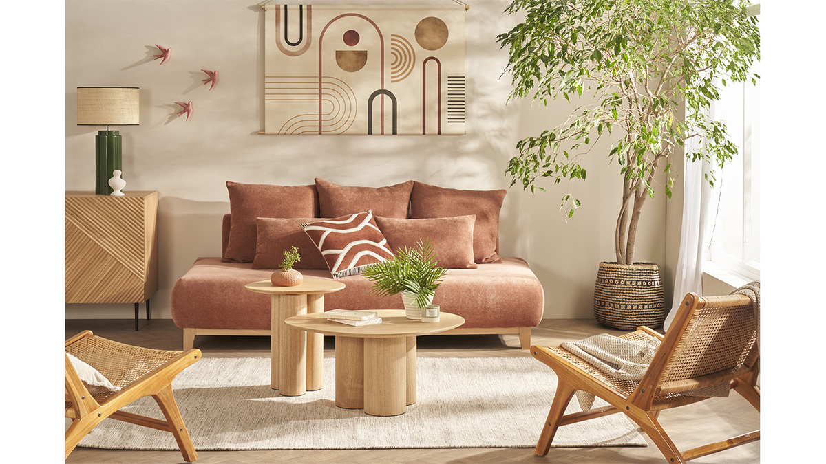 Le motif géométrique inspiré de l'esthétique tribale et les couleurs chaleureuses terracotta, beige, noir et blanc qui le caractérisent en font un coussin déco original qui s'inscrit parfaitement dans la grande tendance du style ethnique. En plus de son esprit graphique qui nous transporte, sa couleur vibrante réveille la pièce. Élément déco de caractère, il s'associe à merveille avec un tapis en jute naturel pour une atmosphère toujours plus authentique.