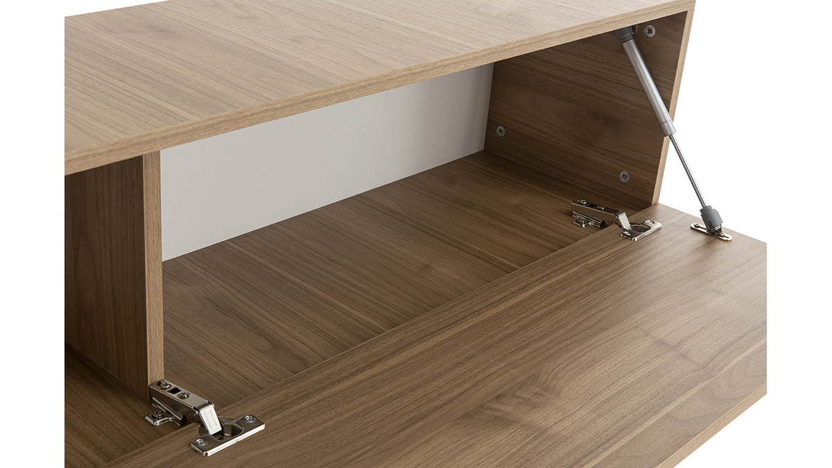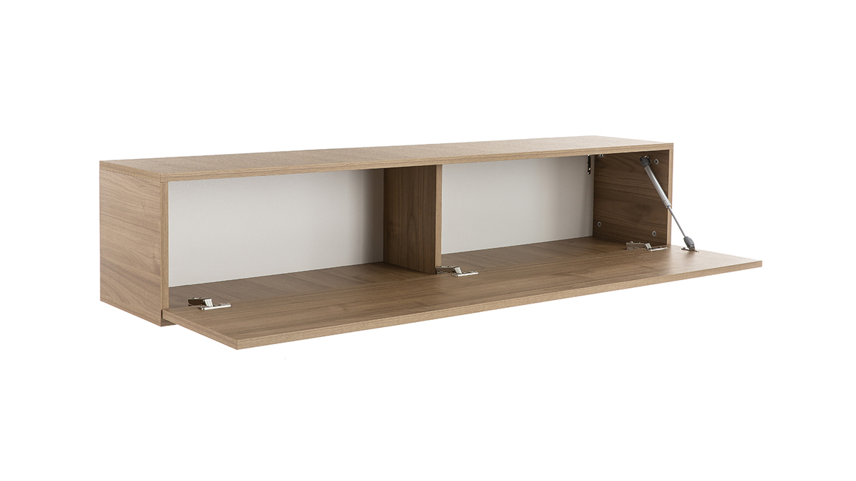 Une fois ouvert, ce meuble de rangement suspendu offre un belle capacité de rangement. ETERNEL se compose de deux niches qui accueilleront les affaires du séjour, télécommande, appareils connectés, magazines...