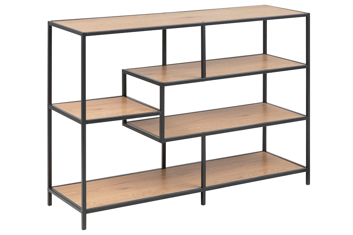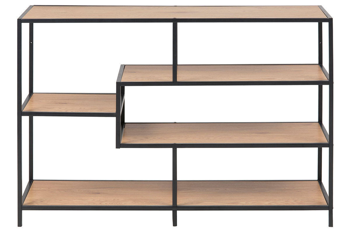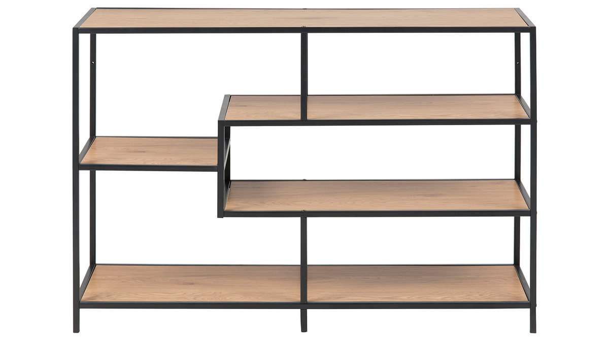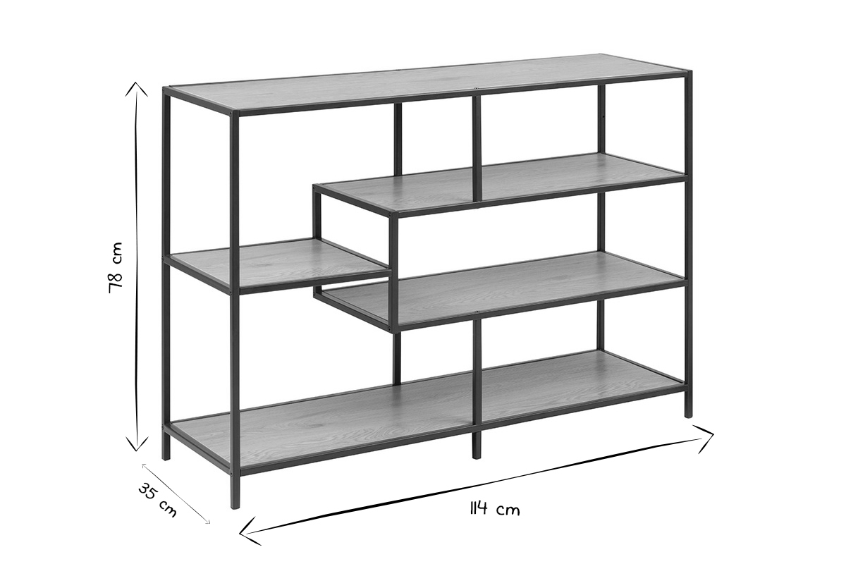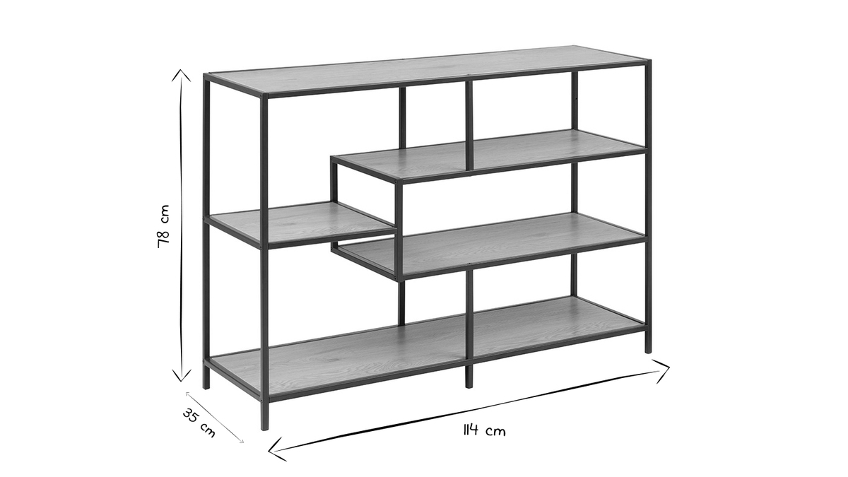 C'est la forme destructurée de ce meuble de rangement bas (dimensions L114 x P35 x H78 cm) qui fait son charme. La structure en métal noir dessine des niches de rangement de tailles et hauteurs différentes offrant un rendu graphique et original. L'ensemble est complété par des étagères en panneaux de fibres de bois finition bois clair pour un effet bimatière chaleureux et tendance.