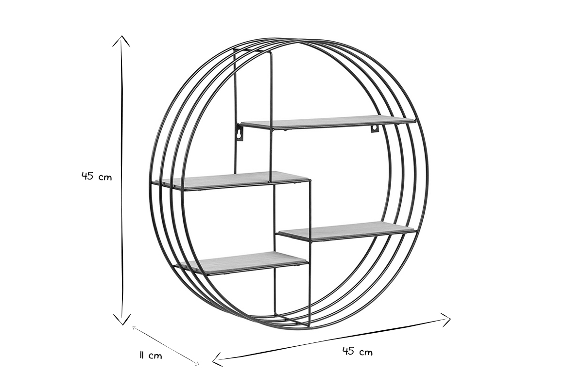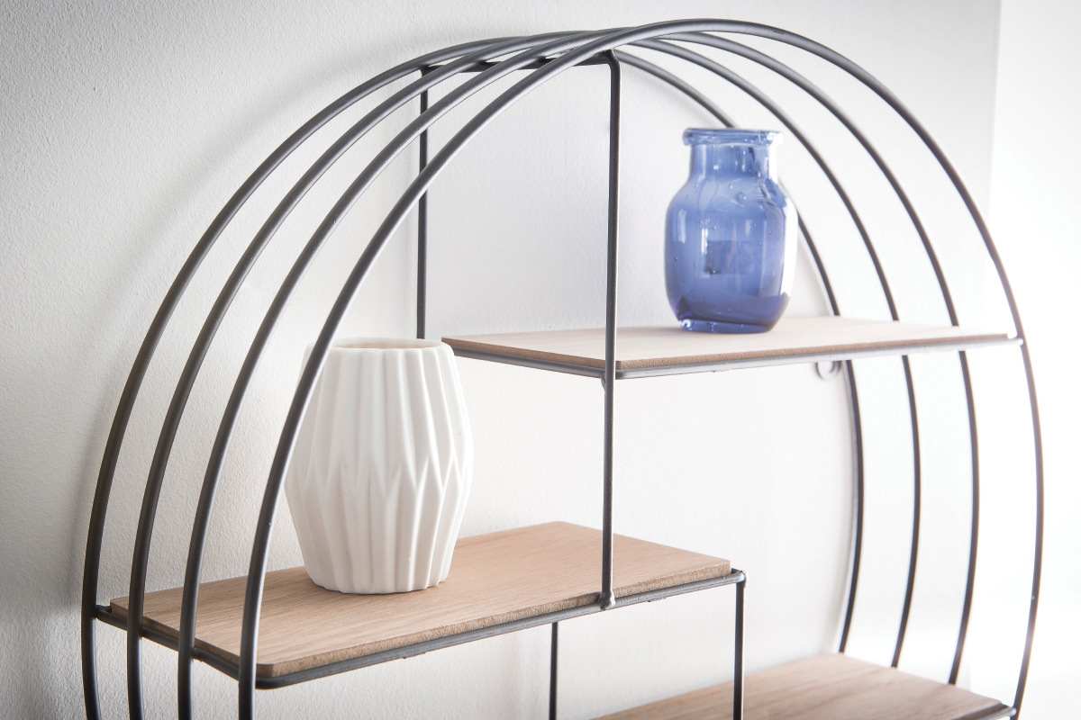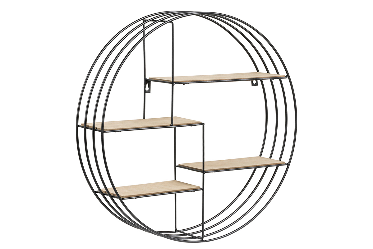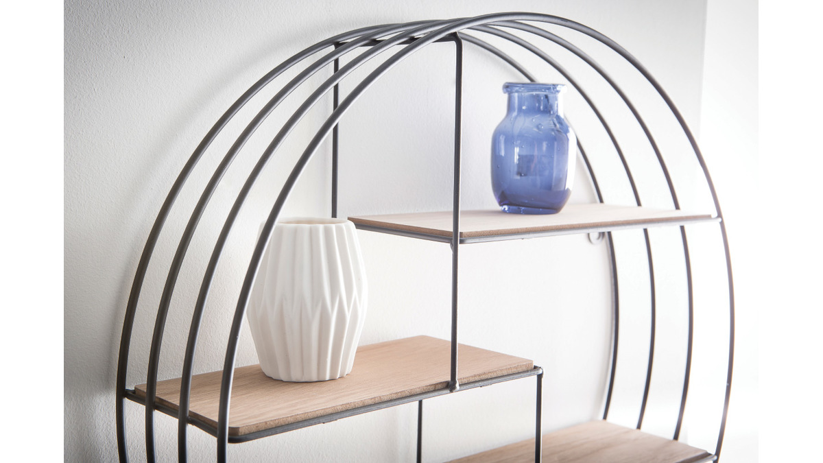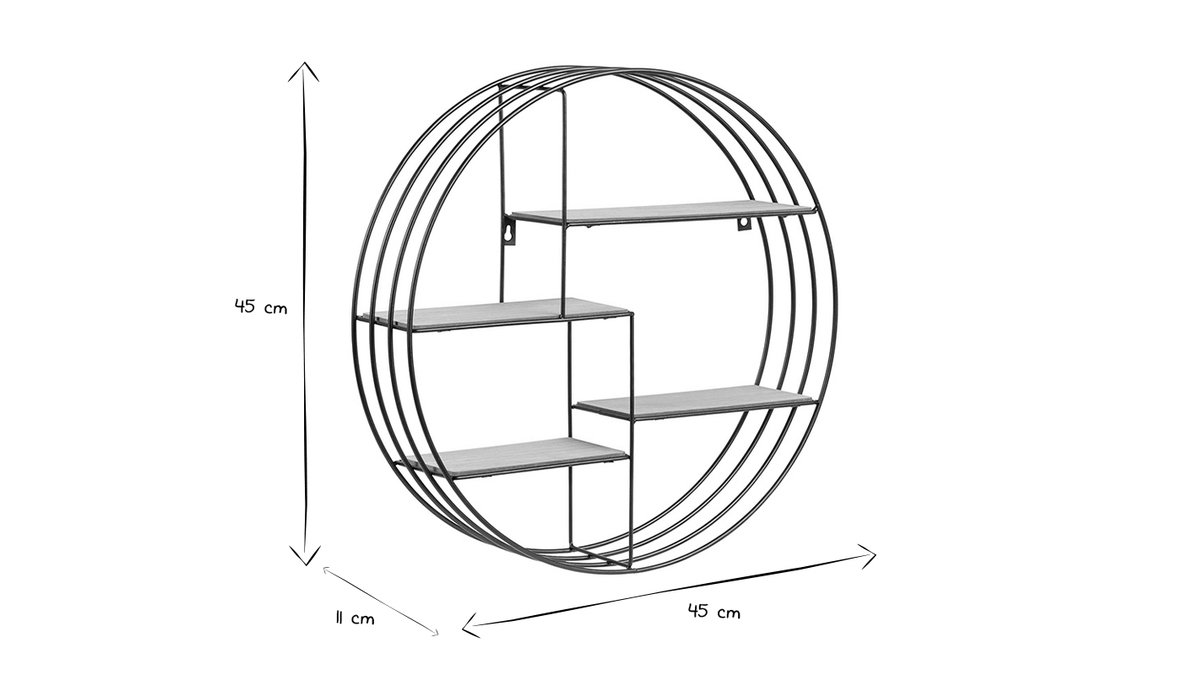 Cette étagère murale ronde combine, dans un mélange subtil, le bois clair et le métal noir pour un rendu moderne. Sa structure métallique, fine et originale, habillera un mur coloré ou blanc tout en offrant un espace pour poser de petits éléments. Le design des étagères - complètement asymétrique - en fait un objet déco à part entière qui trouvera sa place aussi bien dans un séjour que dans une chambre ou une entrée. Pour un rendu des plus harmonieux, ne négligez pas votre décoration murale ! Toiles kakémonos, objets décoratifs à suspendre et appliques murales, sont des éléments sont du plus bel effet lorsqu'ils sont associés.