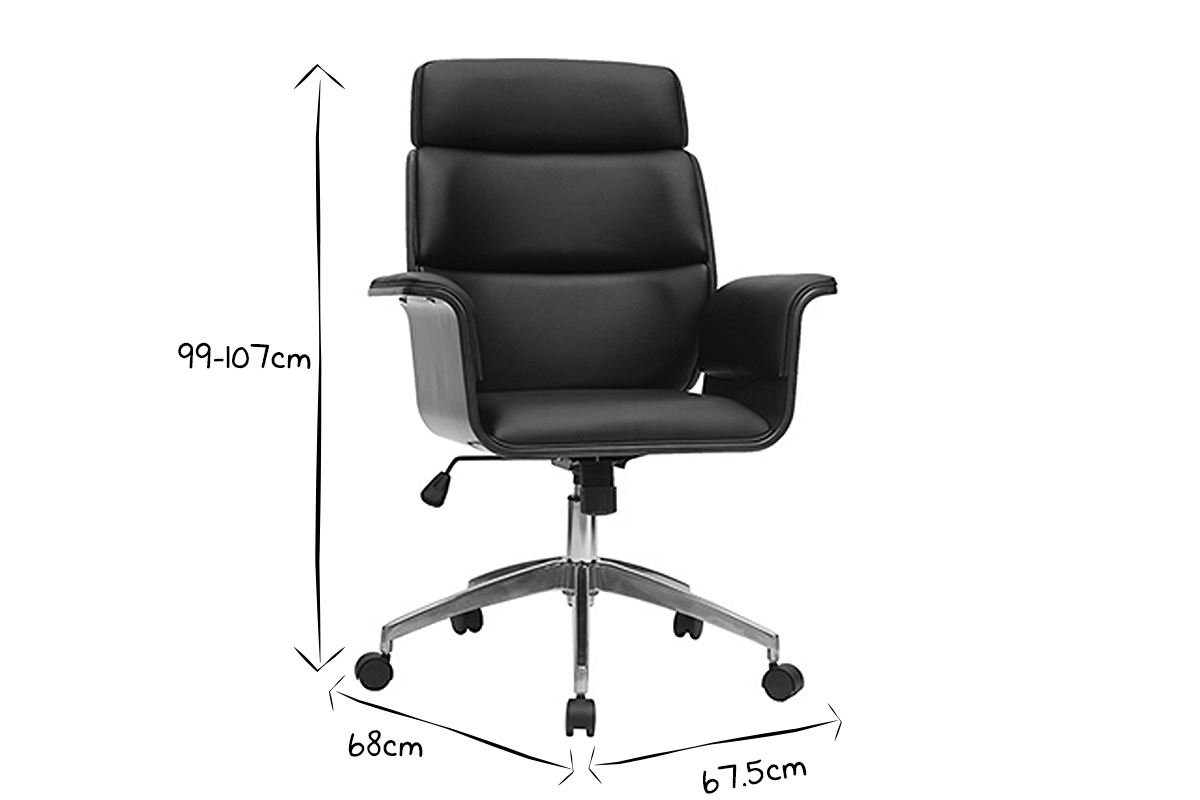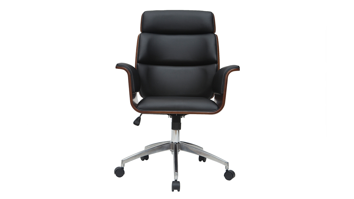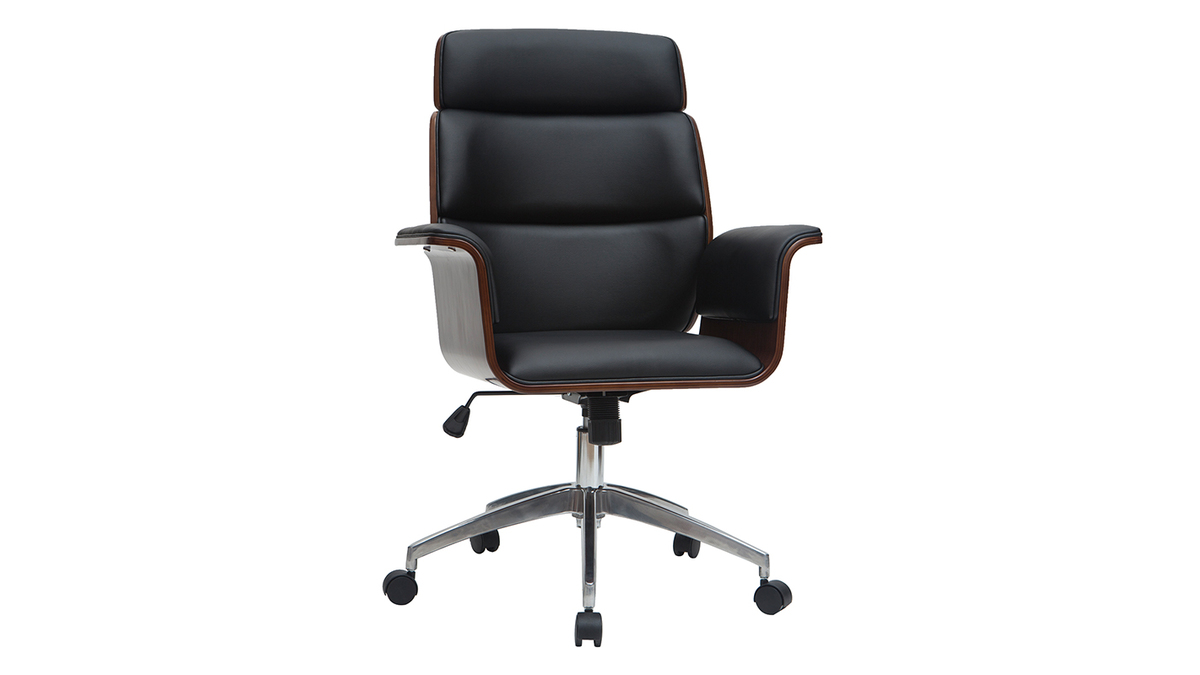 Une structure finition noyer, une assise contrastante en polyuréthane noir, des lignes tout en courbes... ce fauteuil de bureau possède toutes les qualités d'une assise tendance. On apprécie particulièrement ses accoudoirs recourbés et son dossier rembourré qui donnent à l'ensemble un style unique.