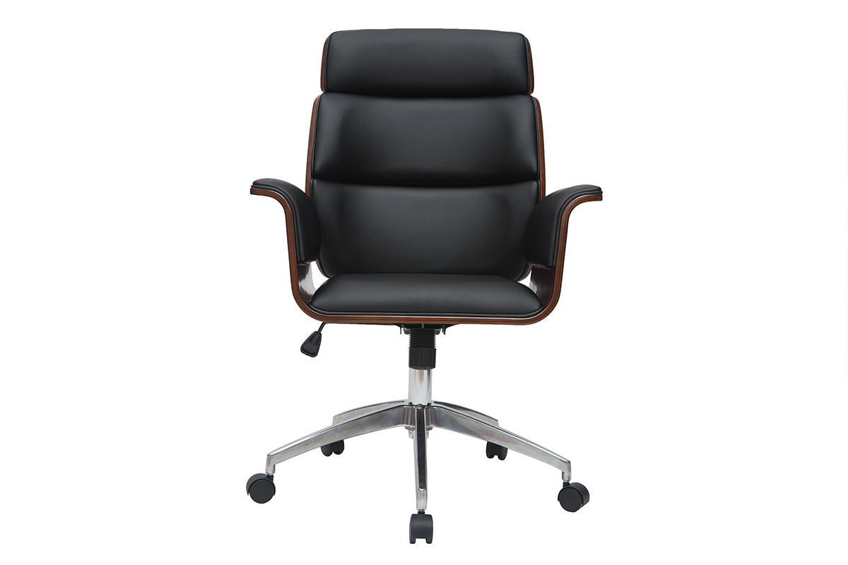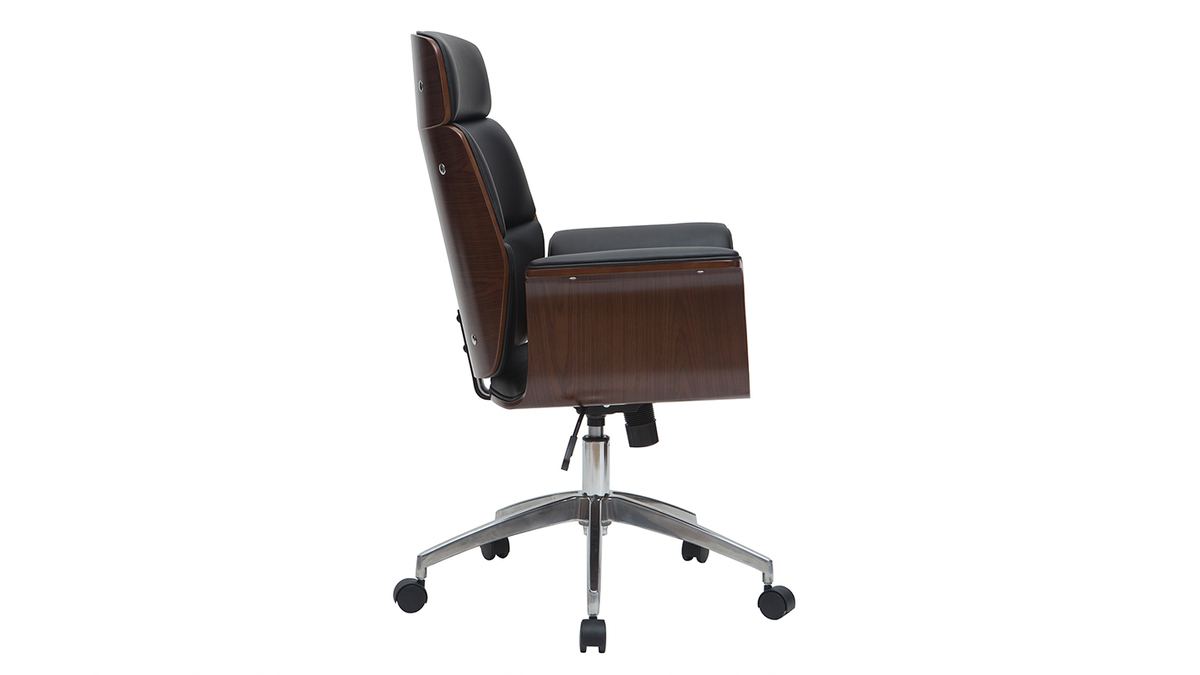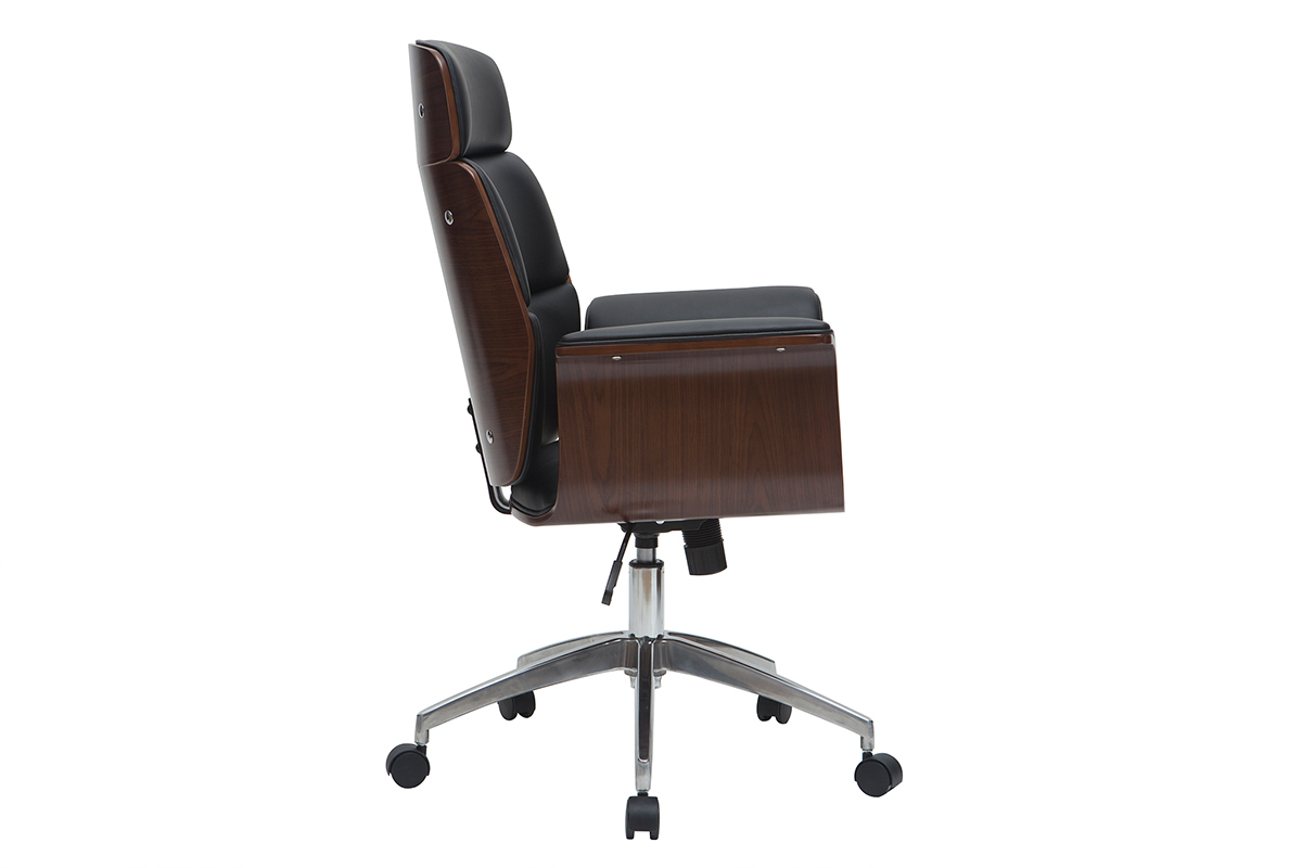 Fauteuil de bureau à roulettes design noir, bois foncé noyer et acier chromé ELON livré prêt à assembler.