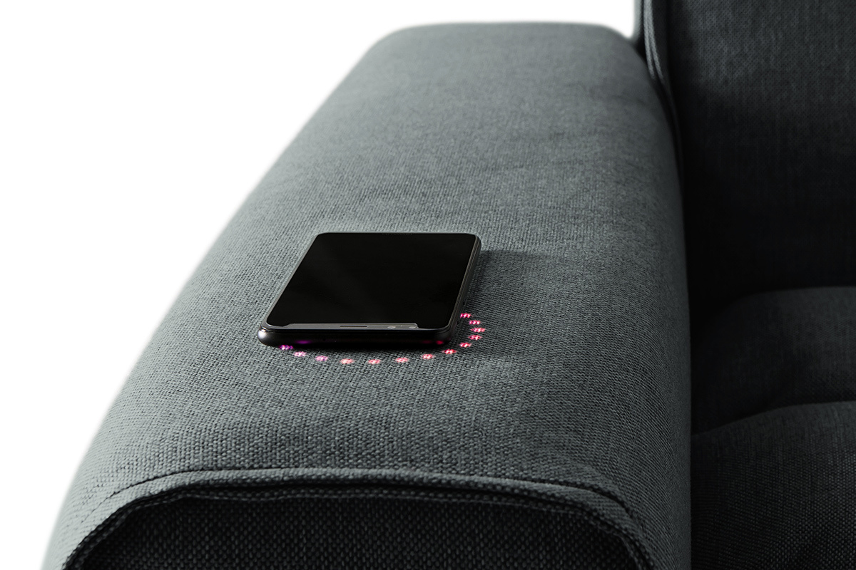 Un chargeur sans fil Qi a été intégré à l'accoudoir pour votre smartphone. Oubliez les câbles et profitez de l'intégralité des fonctions du fauteuil connecté, confortablement installé.