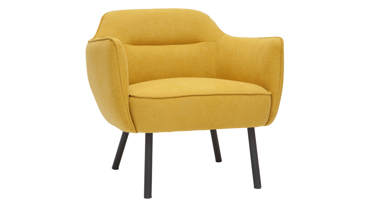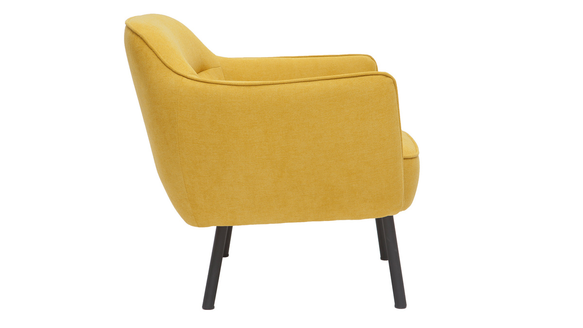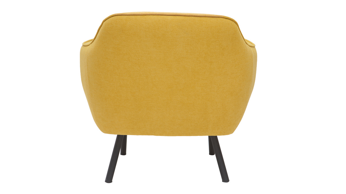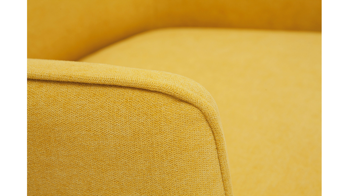 Le fauteuil LAURENS ne laisse personne indifférent avec son tissu effet velours jaune moutarde ultra doux au toucher ainsi que son joli jeu de surpiqûres apparentes.