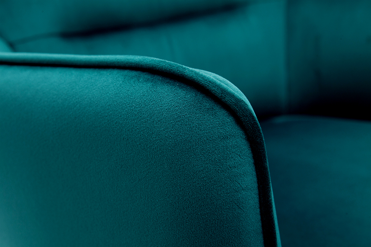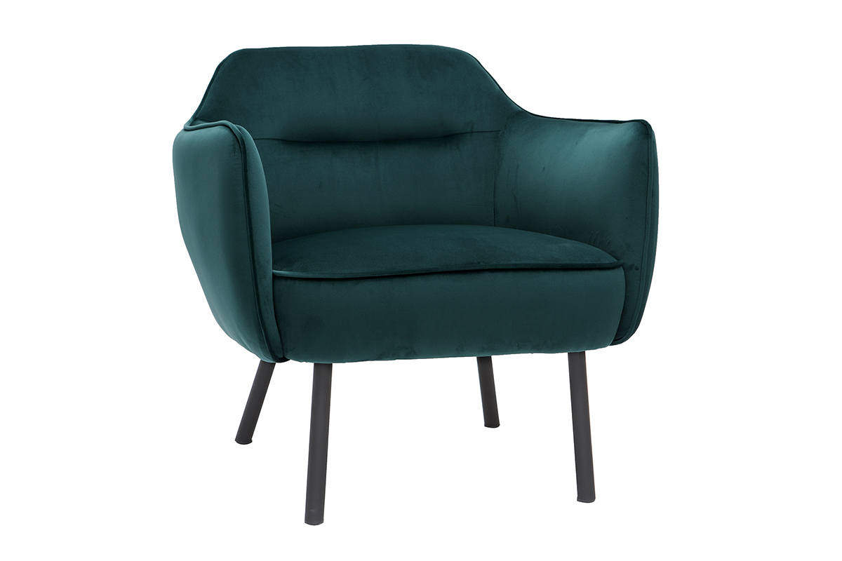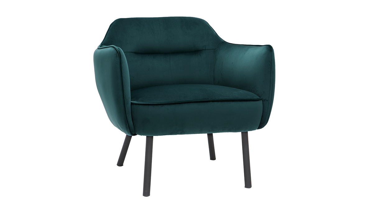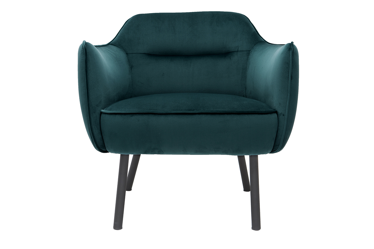 Ce fauteuil au look couture se distingue par son magnifique tissu bleu pétrole dont le velouté sollicite l'oeil autant que la main. L'élégant passepoil ton sur ton qui sculpte le tissu lui confère une élégance folle. On aime aussi le contraste avec ses pieds fins et fuselés en métal noir qui apportent une grande légèreté visuelle.