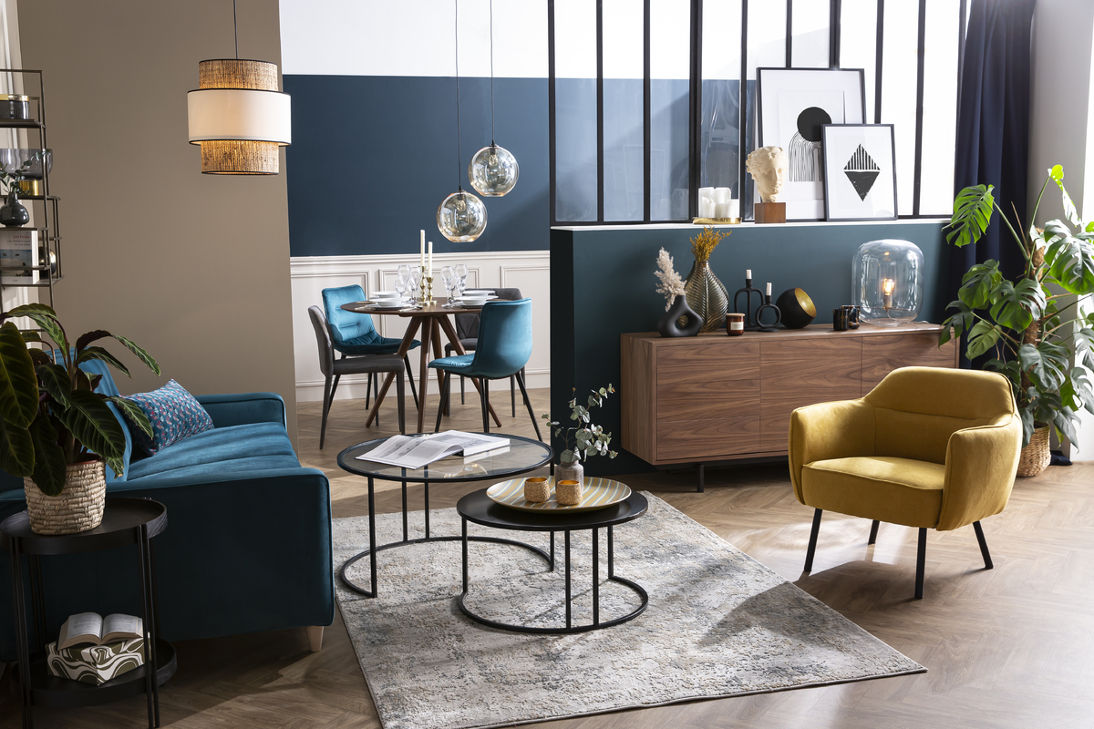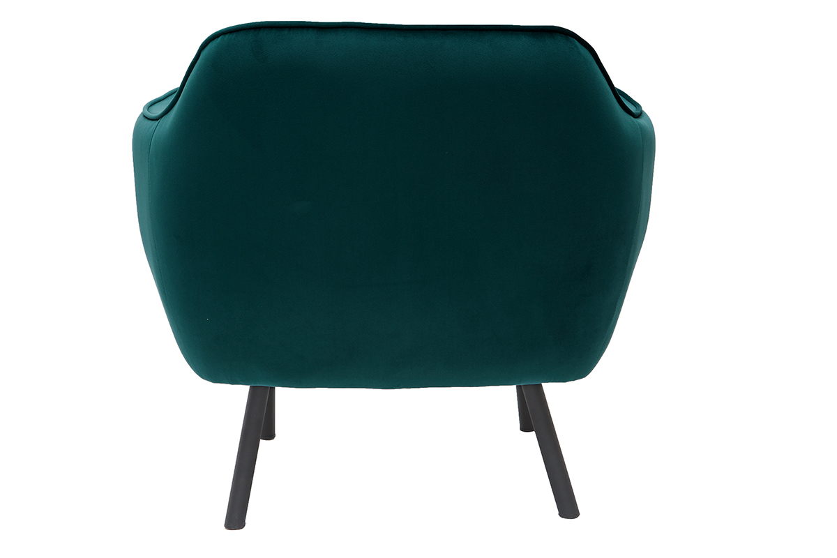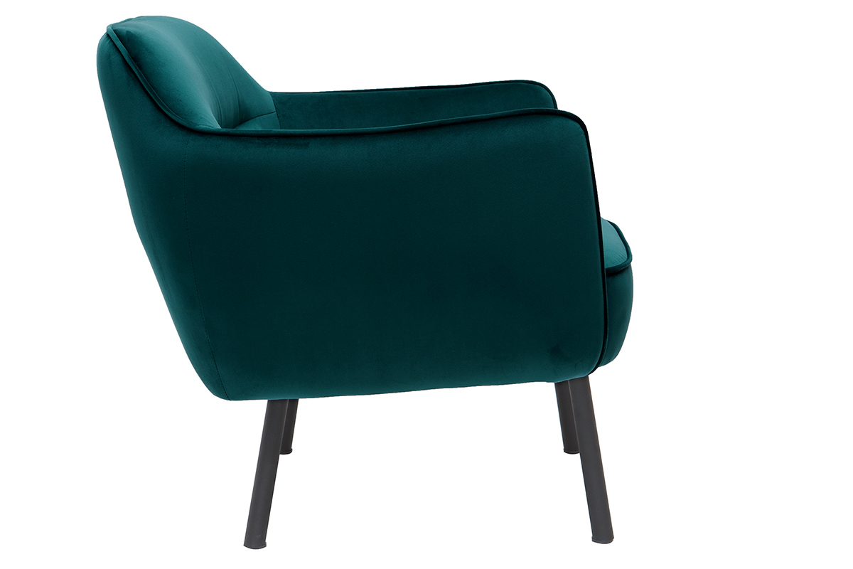 Ce fauteuil au look couture se distingue par son magnifique tissu bleu pétrole dont le velouté sollicite l'oeil autant que la main. L'élégant passepoil ton sur ton qui sculpte le tissu lui confère une élégance folle. On aime aussi le contraste avec ses pieds fins et fuselés en métal noir qui apportent une grande légèreté visuelle.
