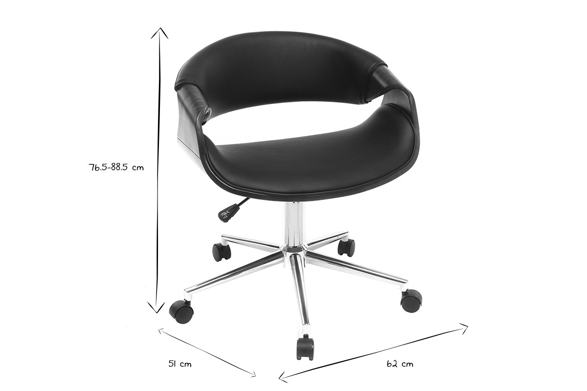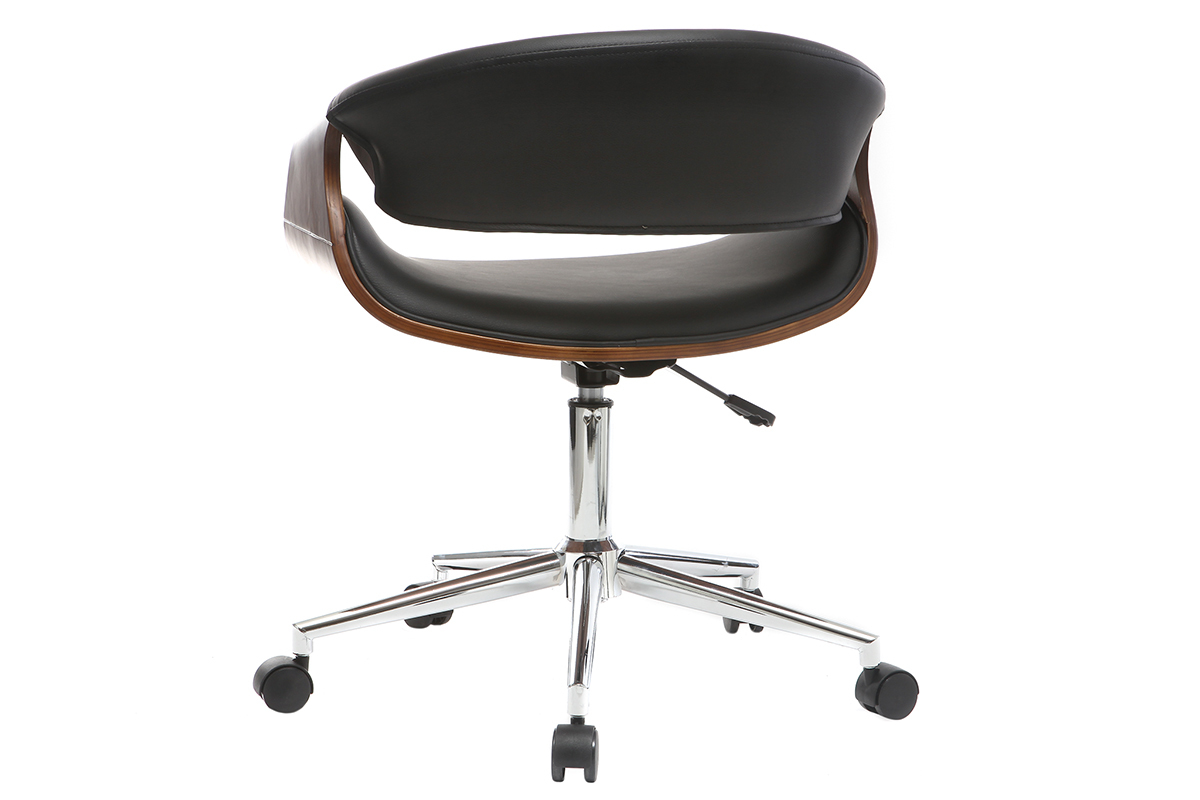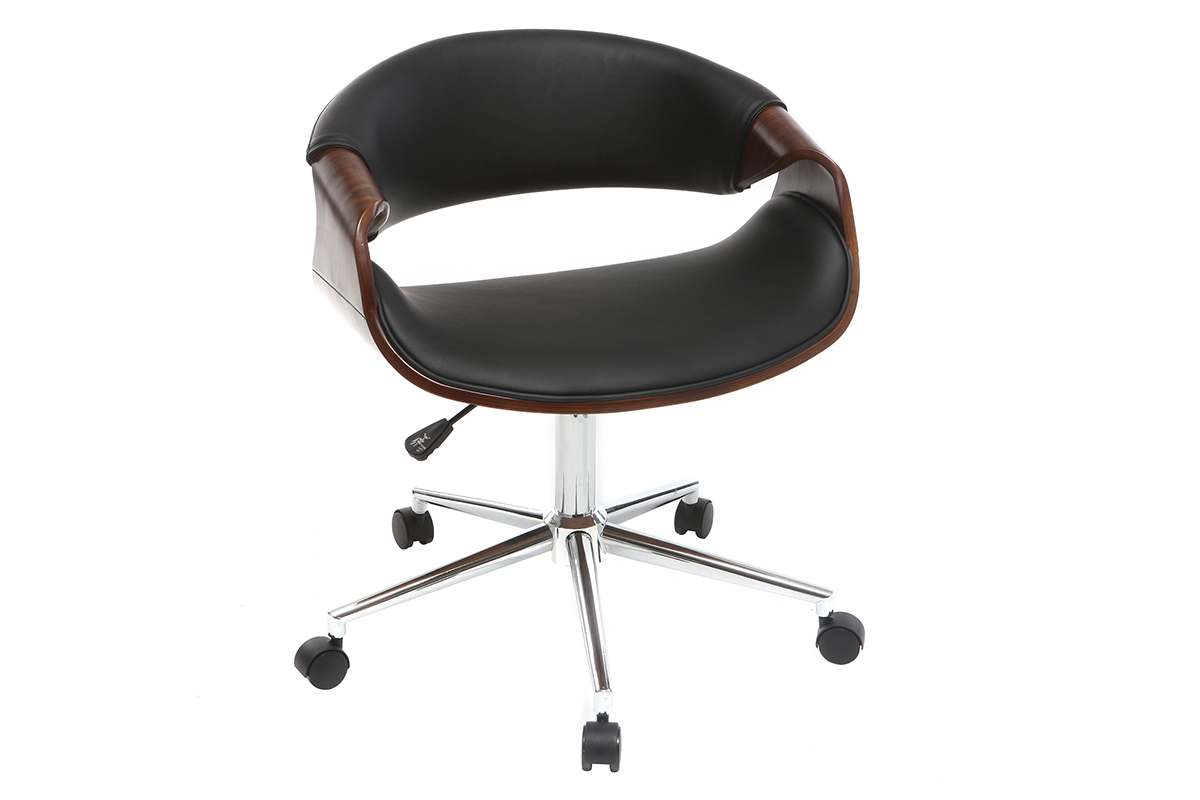 Chaise de bureau à roulettes design noir, bois foncé noyer et acier chromé ARAMIS à assembler. Montage simple.