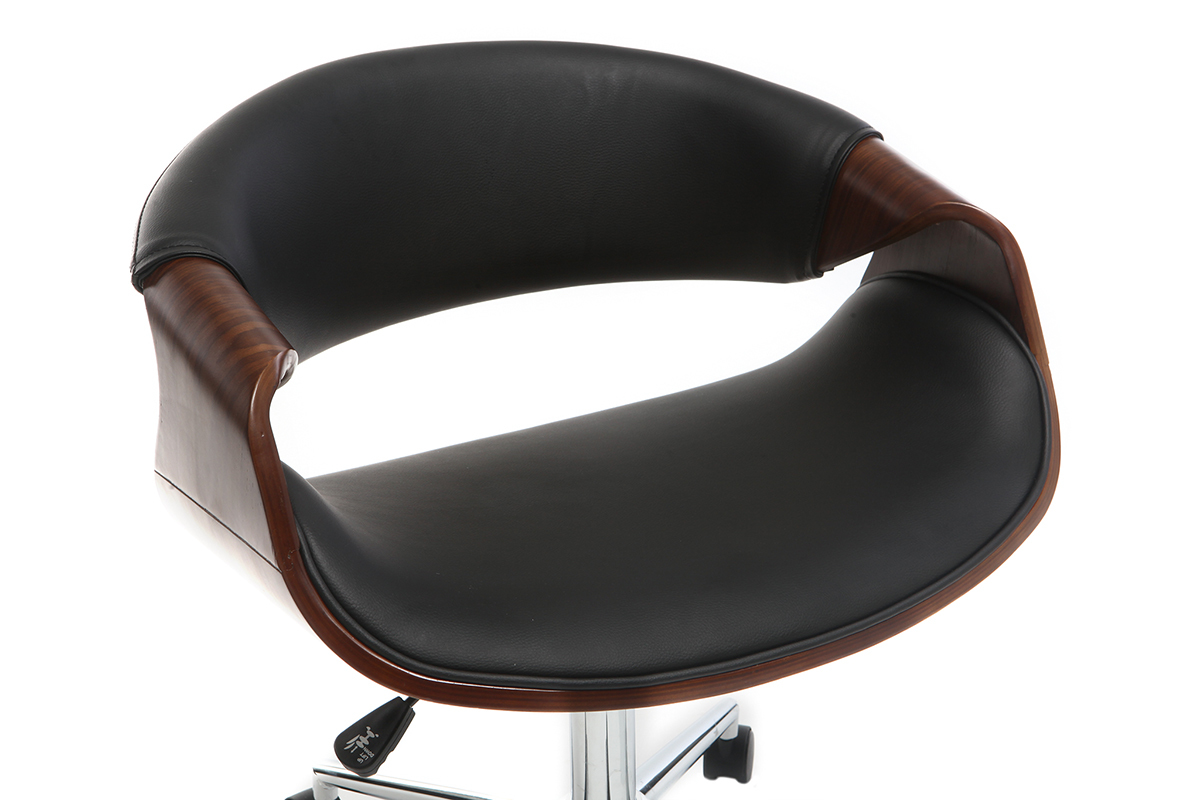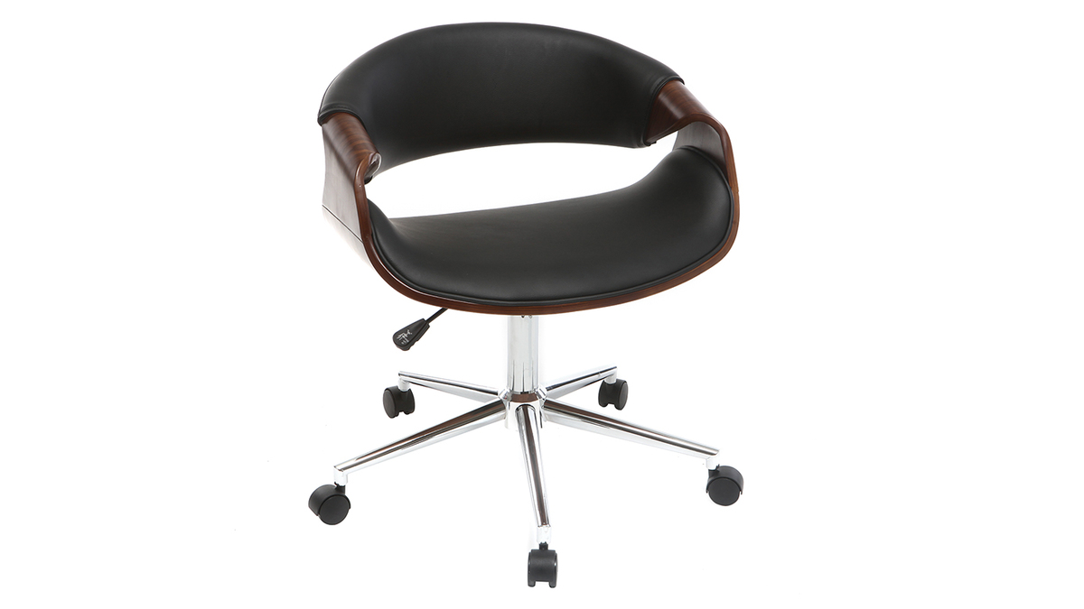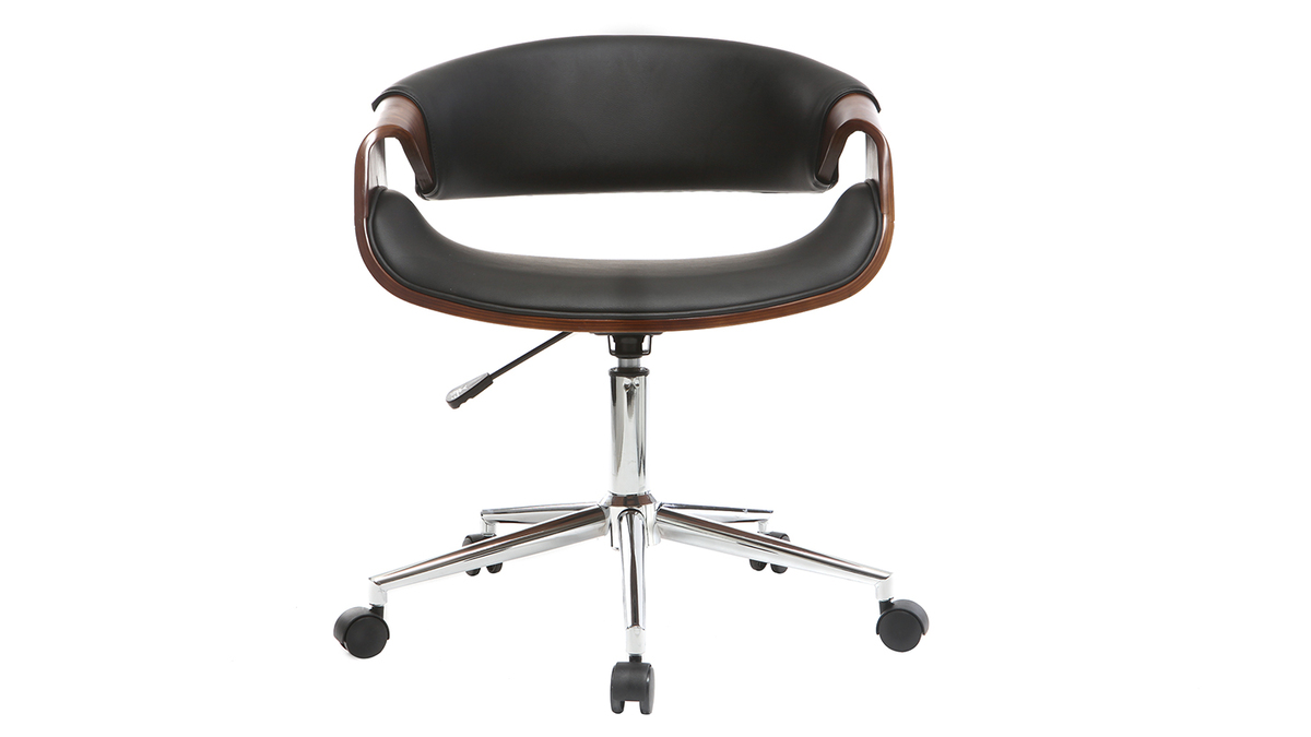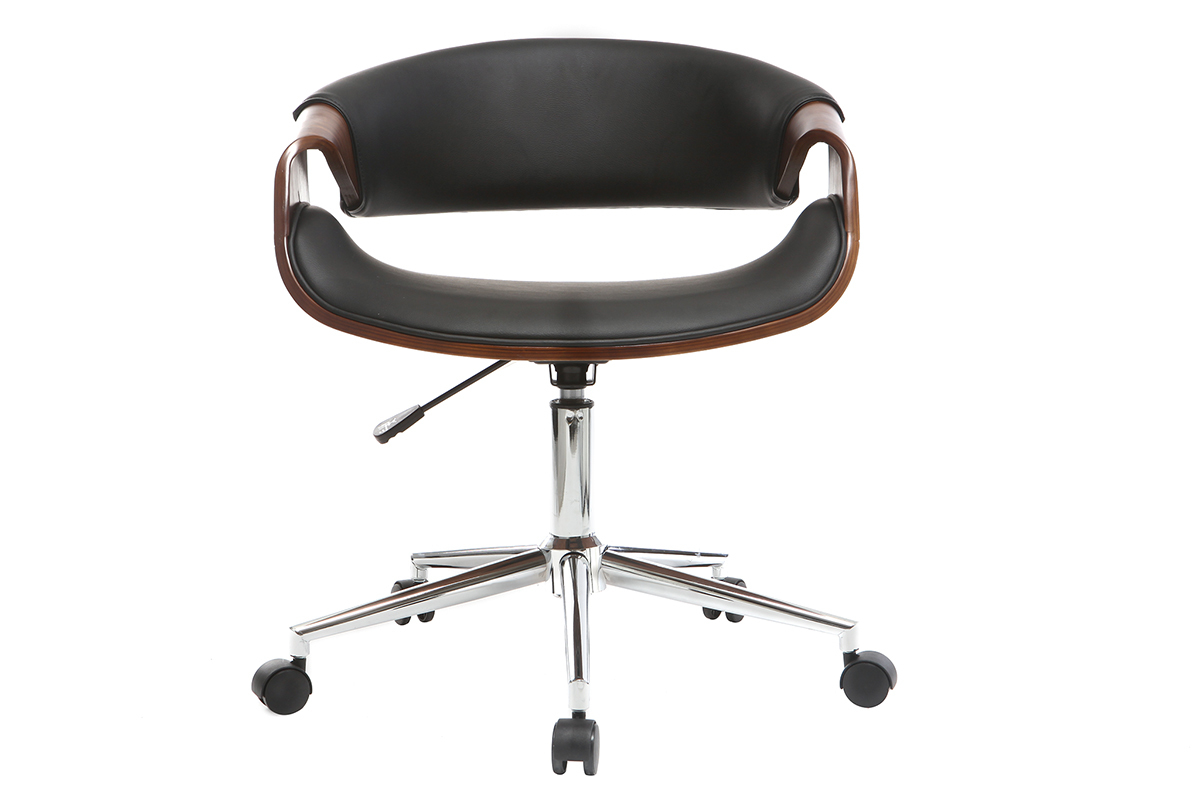 Chaise de bureau à roulettes design noir, bois foncé noyer et acier chromé ARAMIS à assembler. Montage simple.