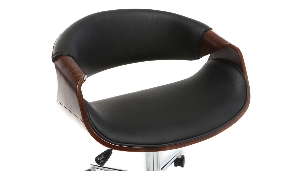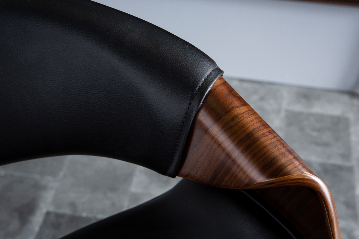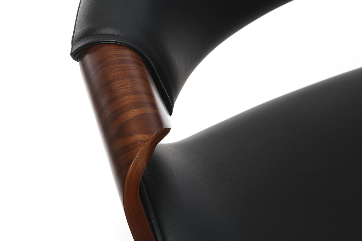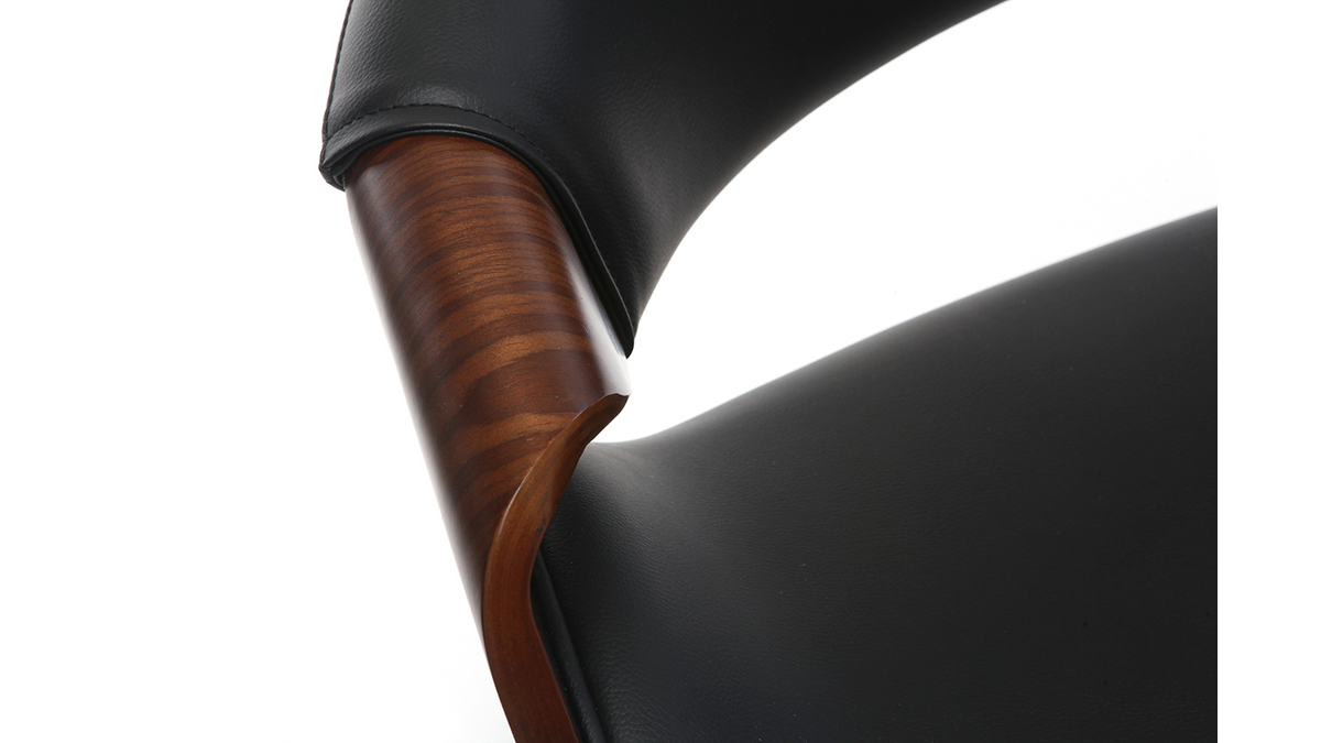 Son assise et son dossier en polyuréthane noir, facile d'entretien, contrastent agréablement avec sa structure en noyer qui lui assure un look vintage très tendance.