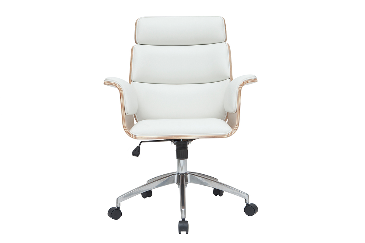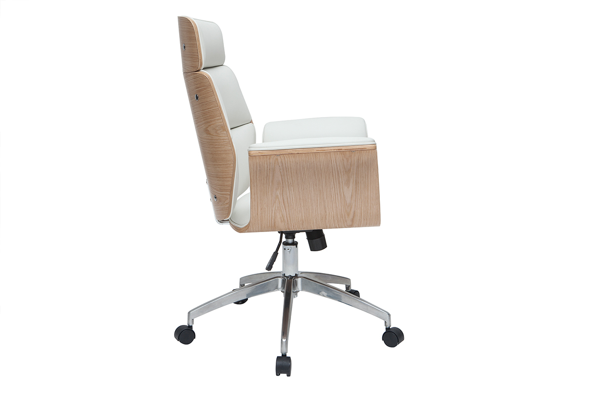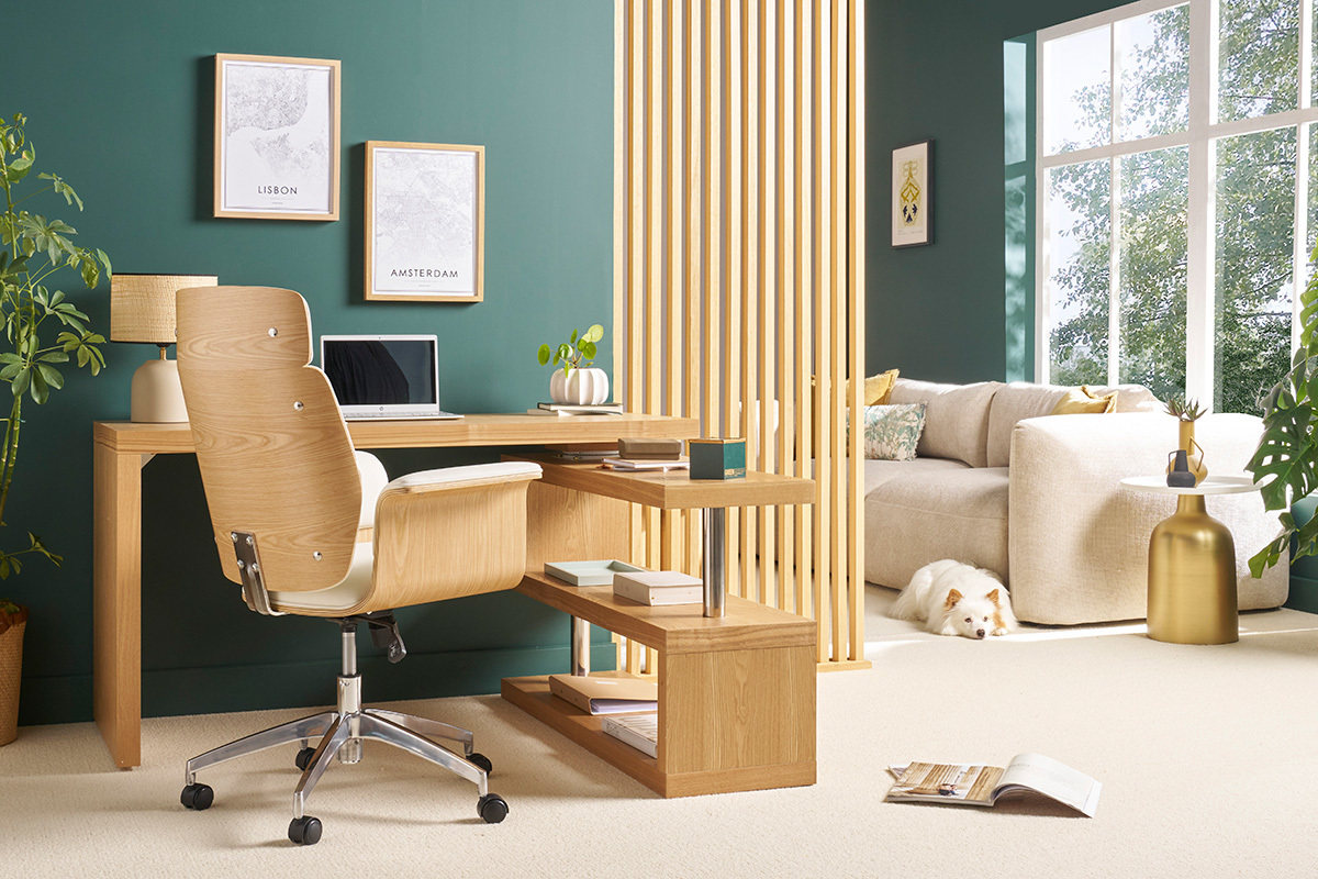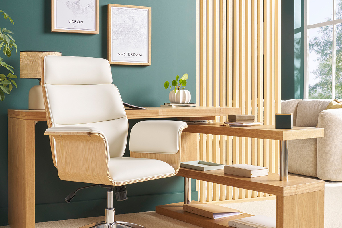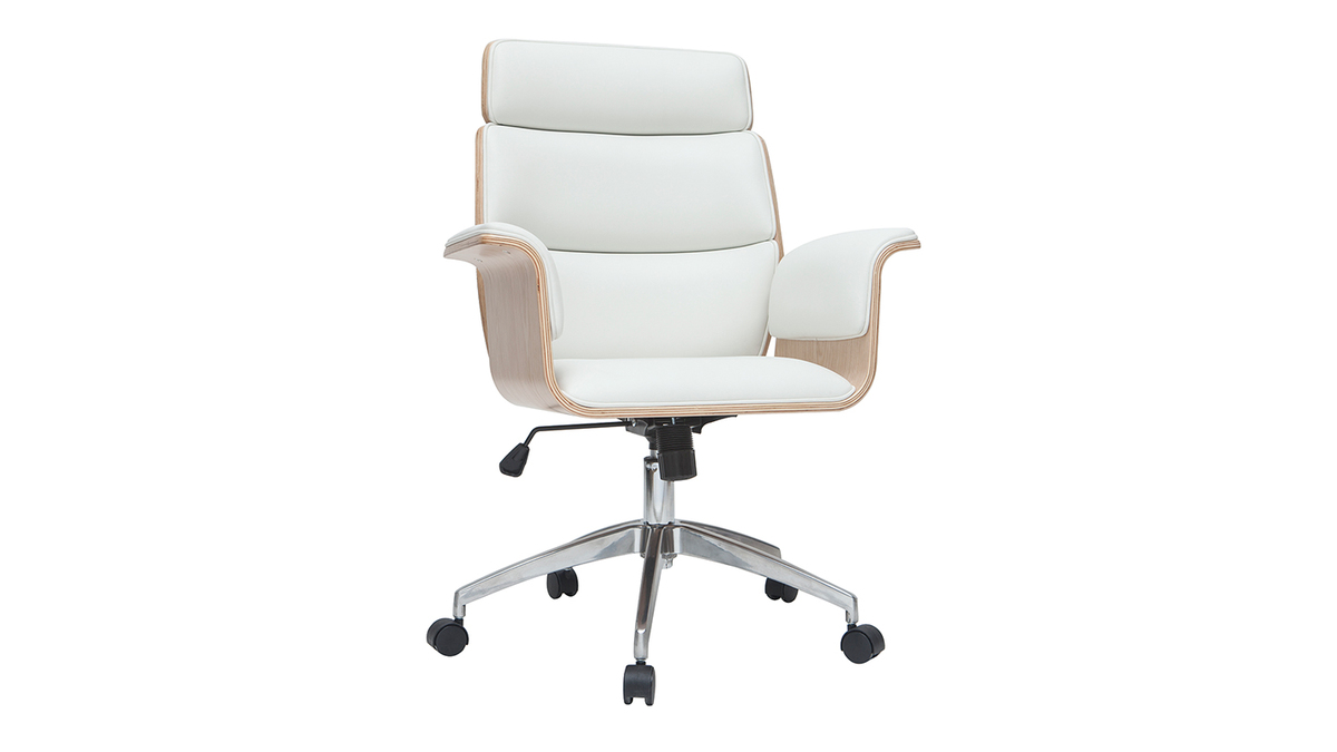 Ce fauteuil de bureau blanc et bois clair réunit confort et style. Pour un espace de travail tendance et fonctionnel, on accompagne ce siège d'un bureau modulable.