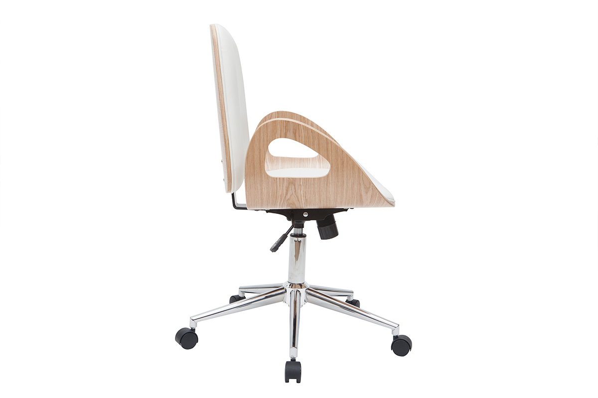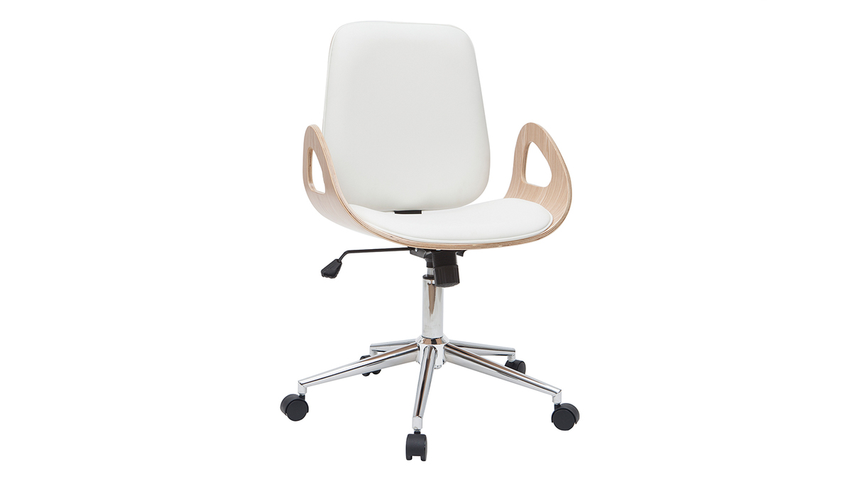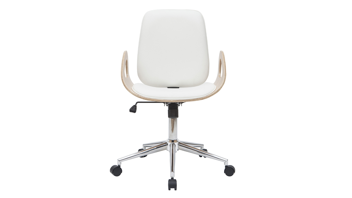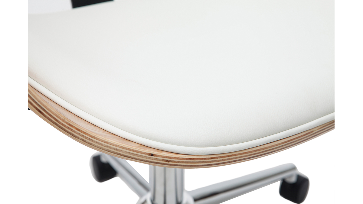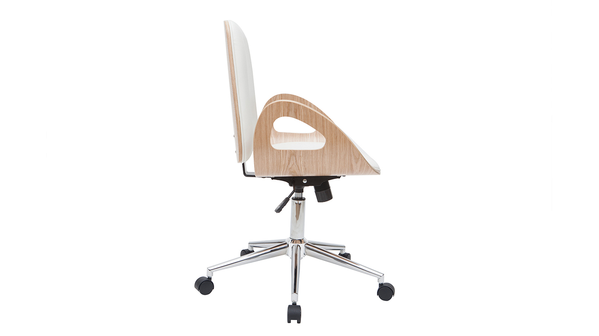 Avec son effet bimatière et son design moderne, ce fauteuil de bureau est une assise dans l'air du temps. La structure finition bois clair en fait une pièce de mobilier chaleureuse. Elle a été associée à un revêtement en polyuréthane blanc pour un rendu élégant et faciliter son entretien.