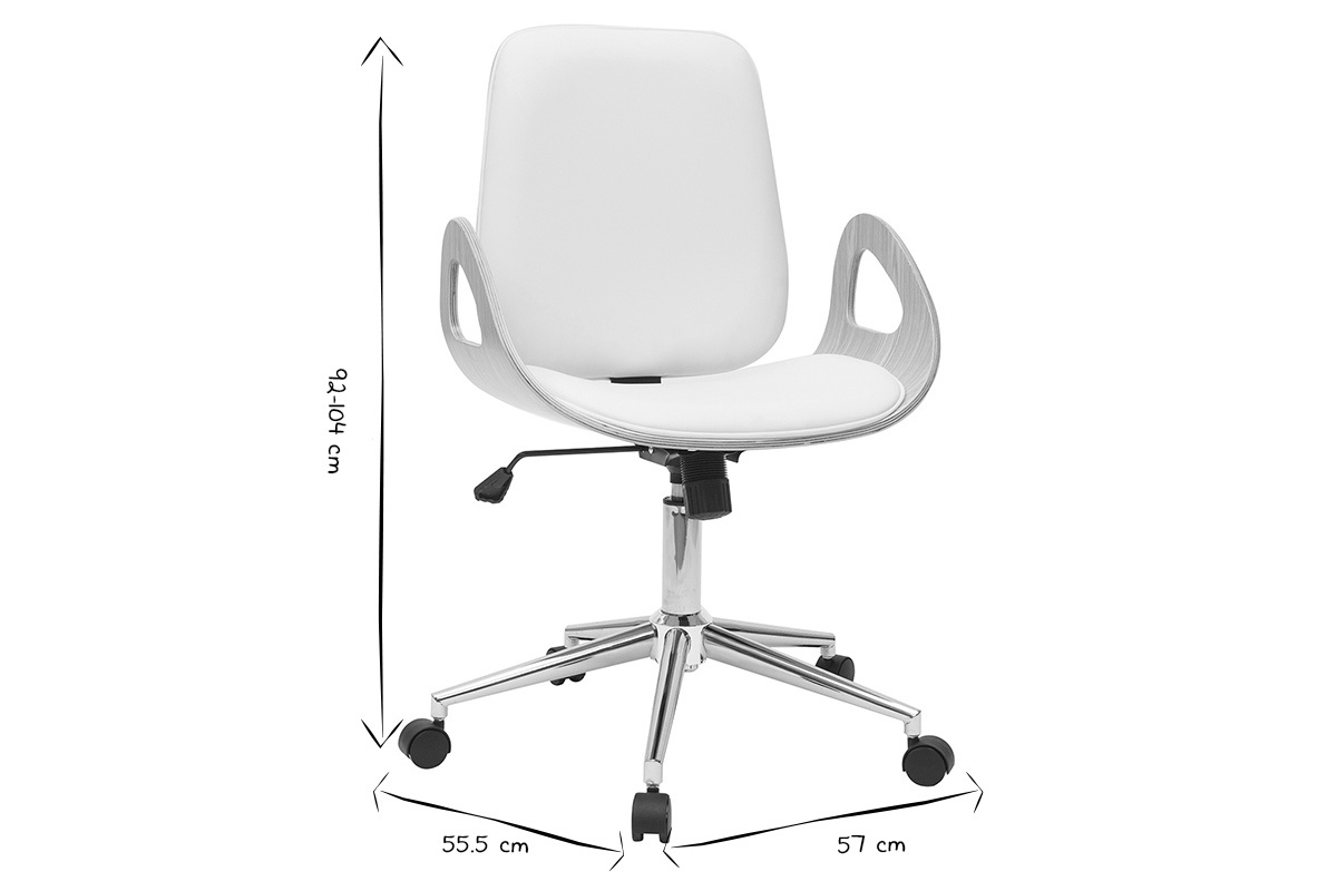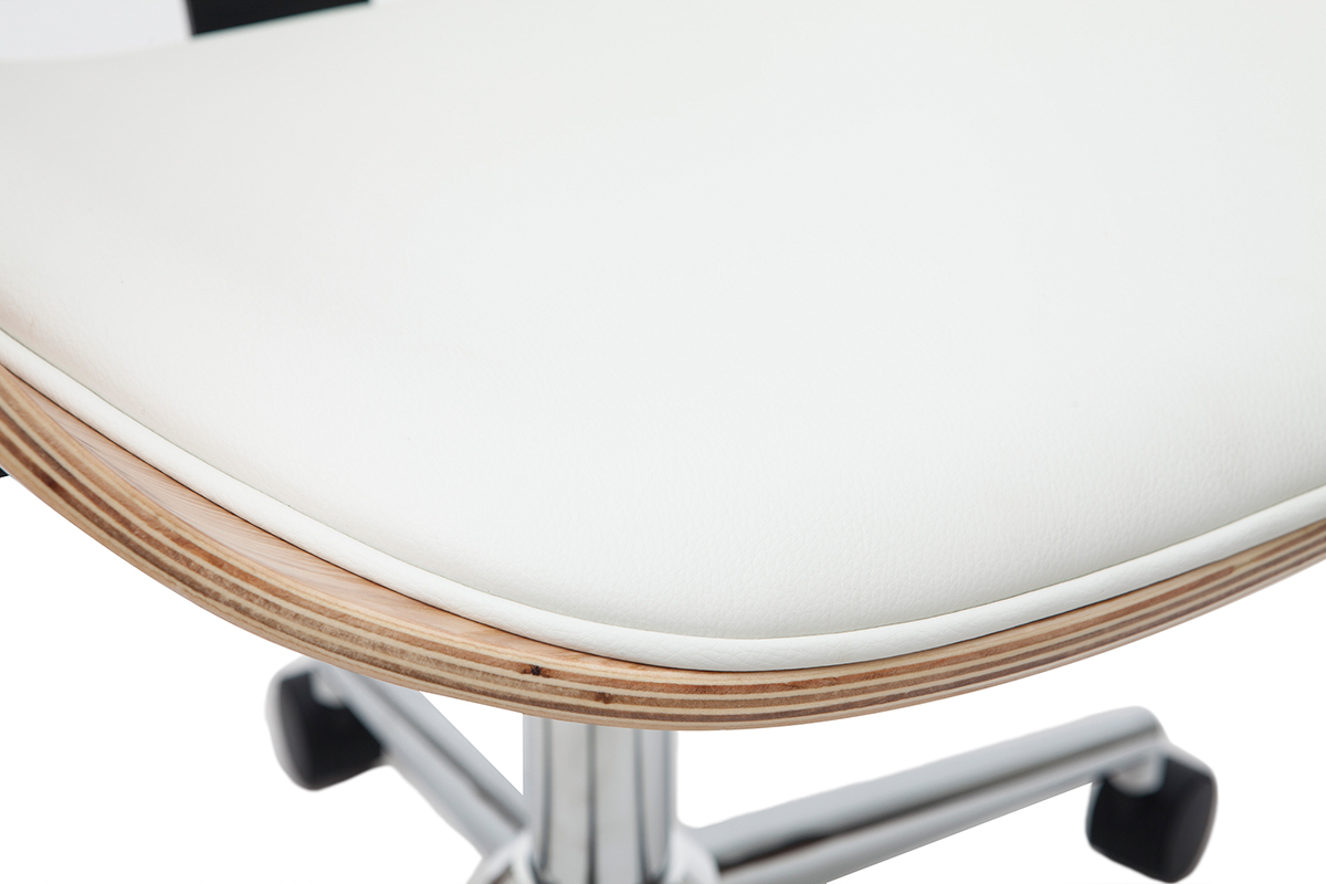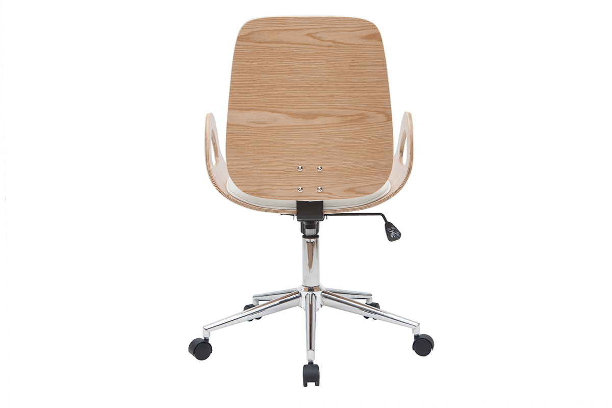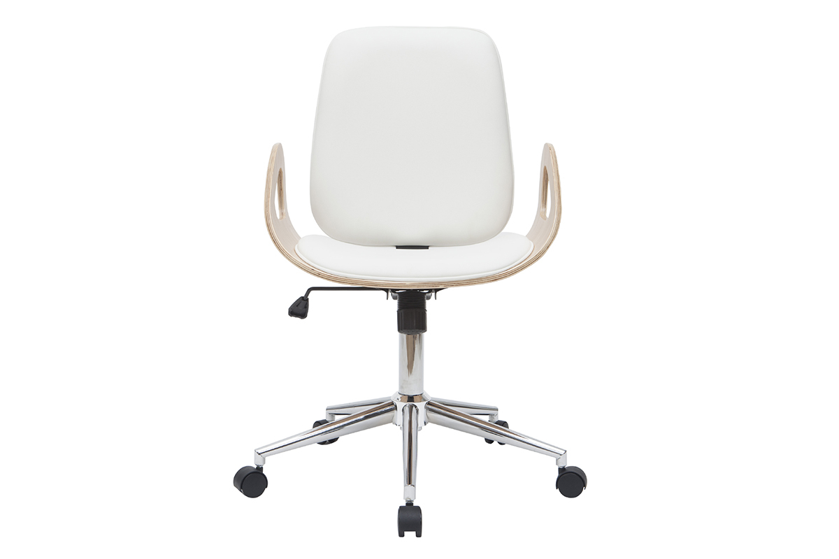 Avec son effet bimatière et son design moderne, ce fauteuil de bureau est une assise dans l'air du temps. La structure finition bois clair en fait une pièce de mobilier chaleureuse. Elle a été associée à un revêtement en polyuréthane blanc pour un rendu élégant et faciliter son entretien.