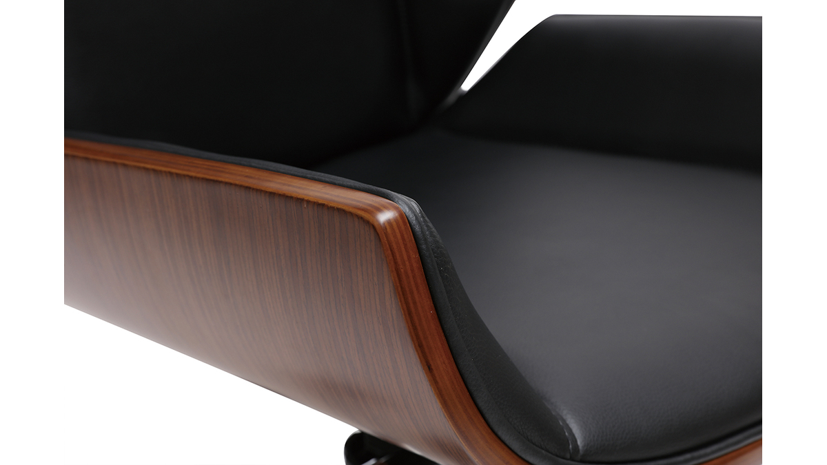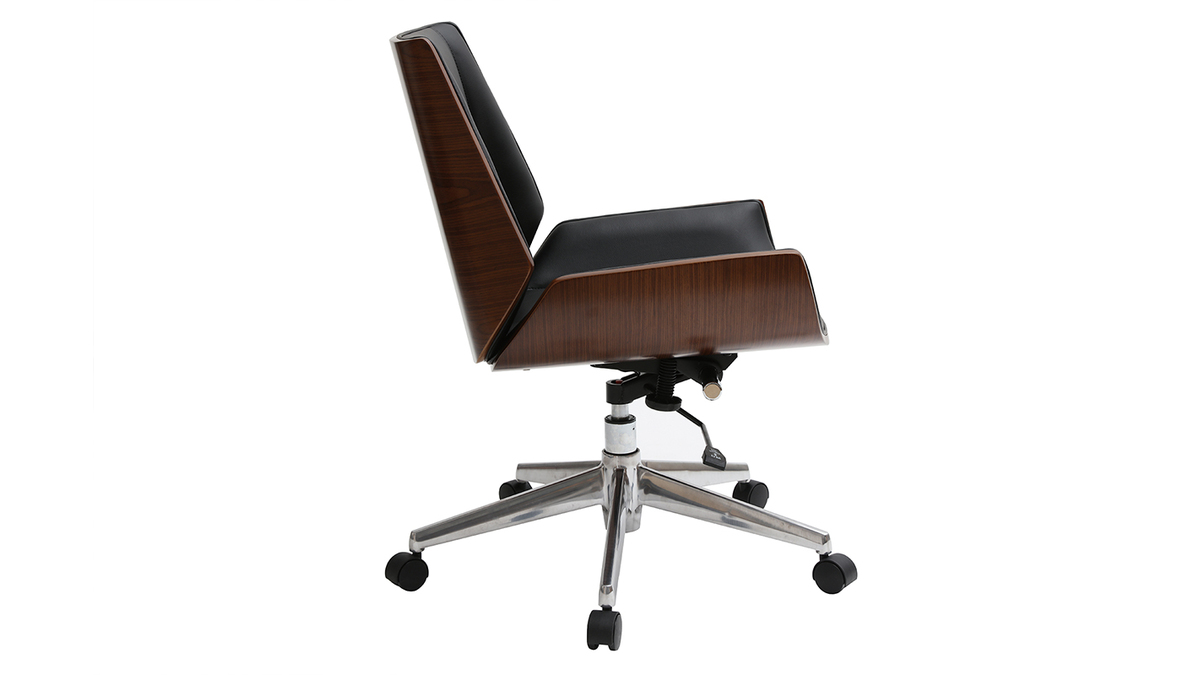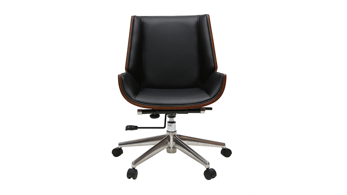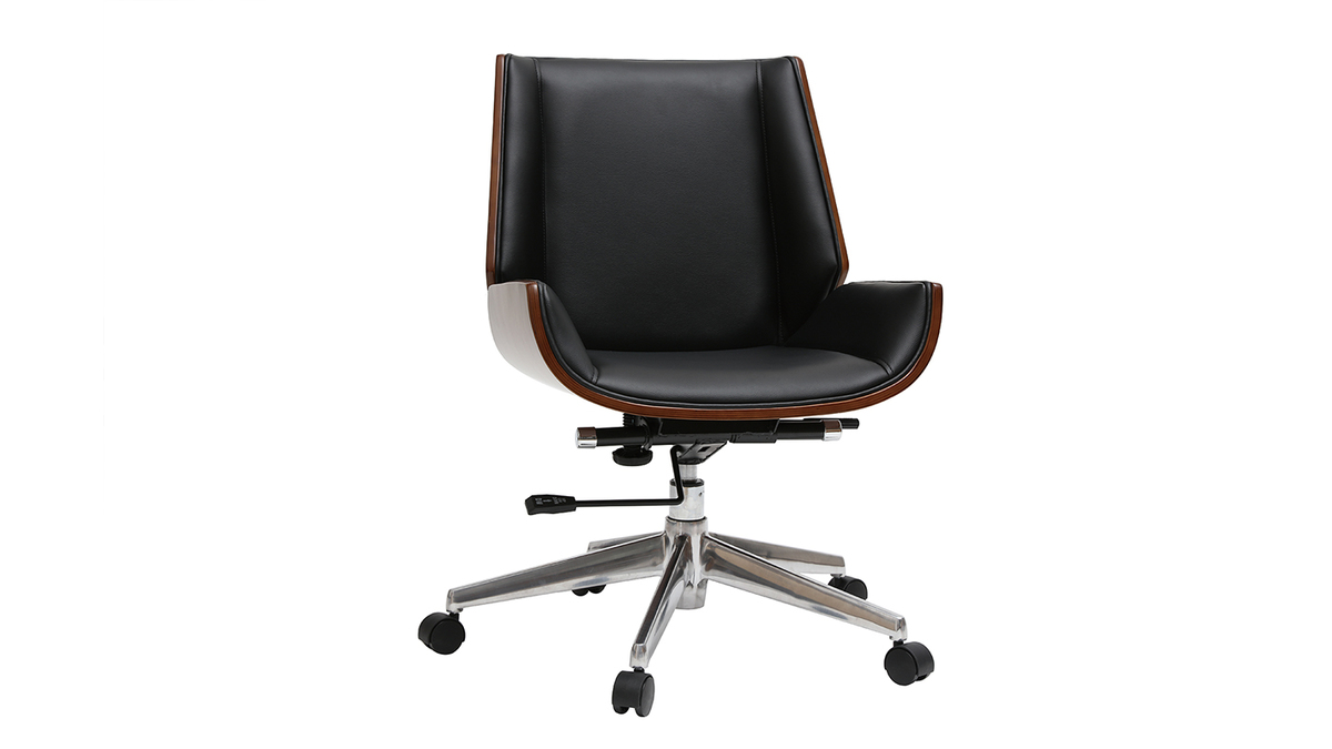 Ce joli fauteuil de bureau aux lignes marquées habillera parfaitement votre bureau d'inspiration vintage ou industrielle. Sa structure en bois foncé apporte de la chaleur et du cachet à votre coin bureau tandis que l'assise et le dossier en polyuréthane noir habillera la pièce en apportant de la profondeur.