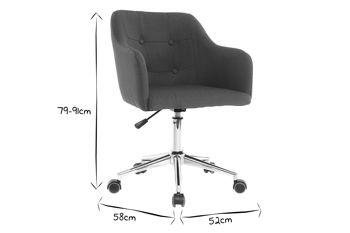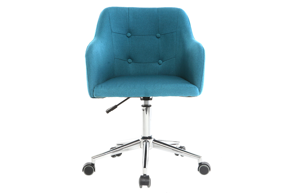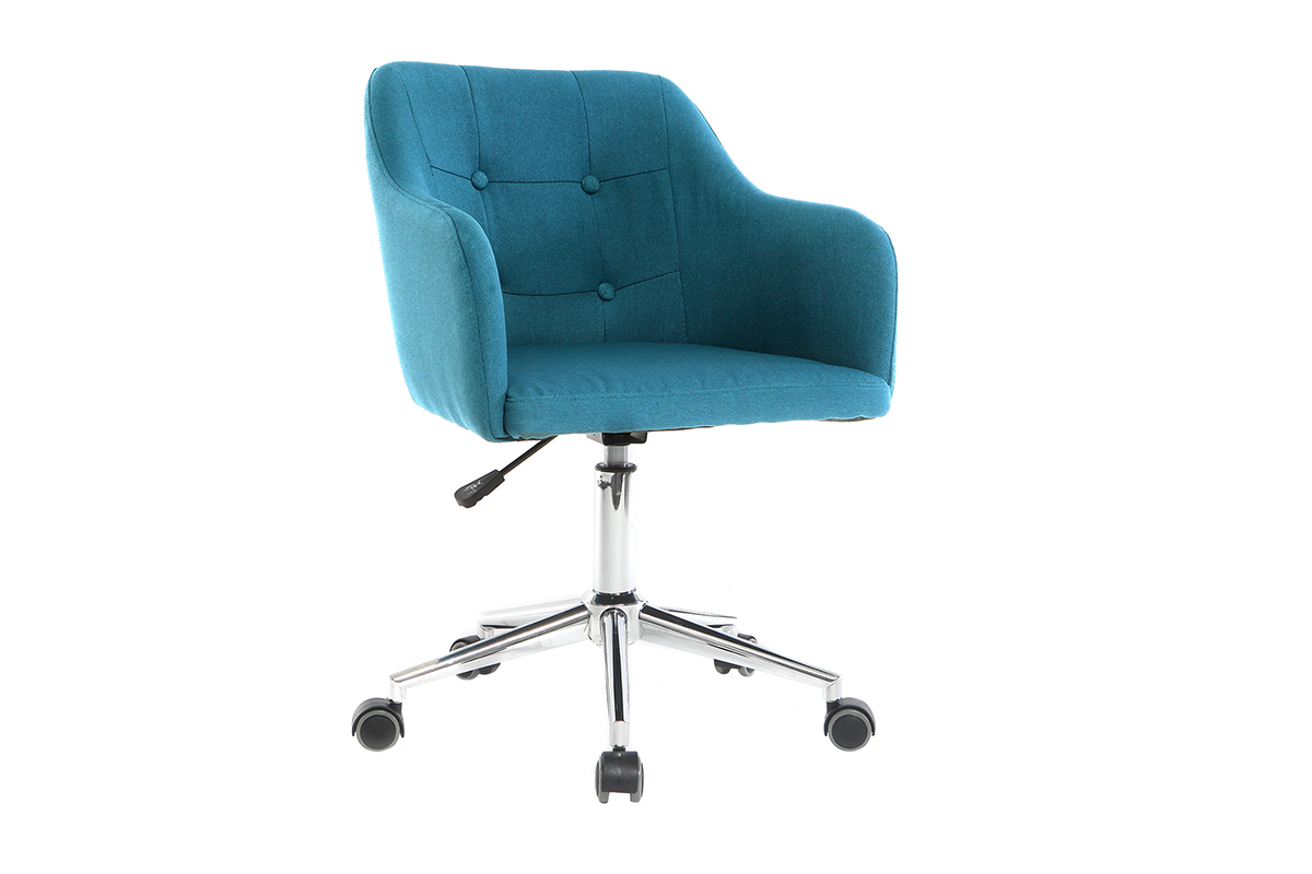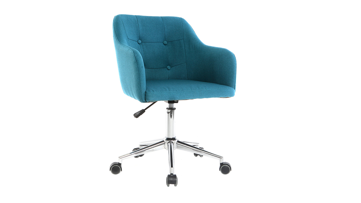 Son piètement en acier chromé associé à un revêtement en tissu bleu canard fait de ce fauteuil de bureau un siège moderne et harmonieux. Ses finitions capitonnées lui apportent une touche élégante et raffinée pour un espace de travail plein de charme.