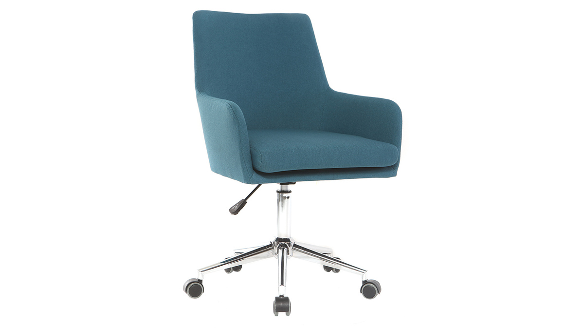 Avec sa forme moderne et son revêtement en tissu bleu canard, cette chaise de bureau apportera une touche déco à l'espace de travail. Grâce à son grand dossier, ses accoudoirs et son coussin d'assise d'une densité de 24 kg/m³, elle est adaptée à un usage quotidien et offre un très bon confort d'assise, idéal pour les longs moments passés derrière son bureau. Grâce à son pied réglable en hauteur, le modèle SHANA s'adapte à chaque utilisateur : son assise passe de 45 à 53 cm de haut en un clin d'oeil. Pour plus de praticité, ce fauteuil pivote et est équipé de 5 roulettes pour se déplacer aisément.