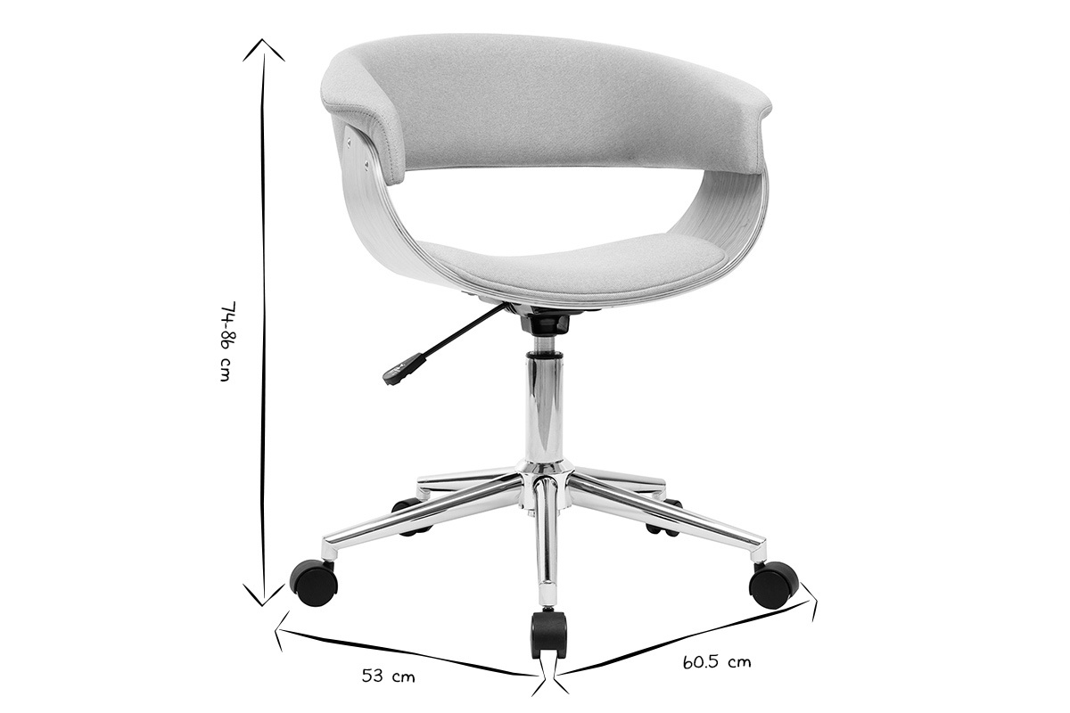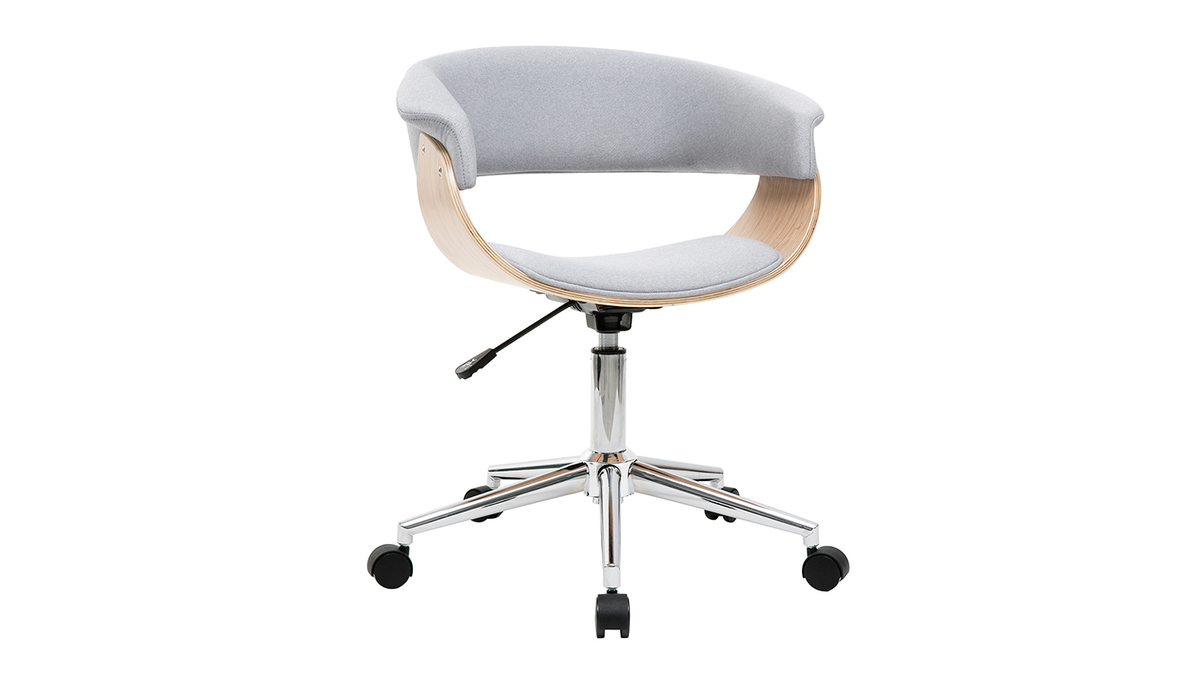Revêtu de tissu gris clair, cette chaise de bureau à roulettes associe joliment une couleur sobre et un bois clair qui rappelle les codes du style scandinave. Elle se mariera très facilement avec une décoration et un bureau d'inspiration scandinave comme moderne !