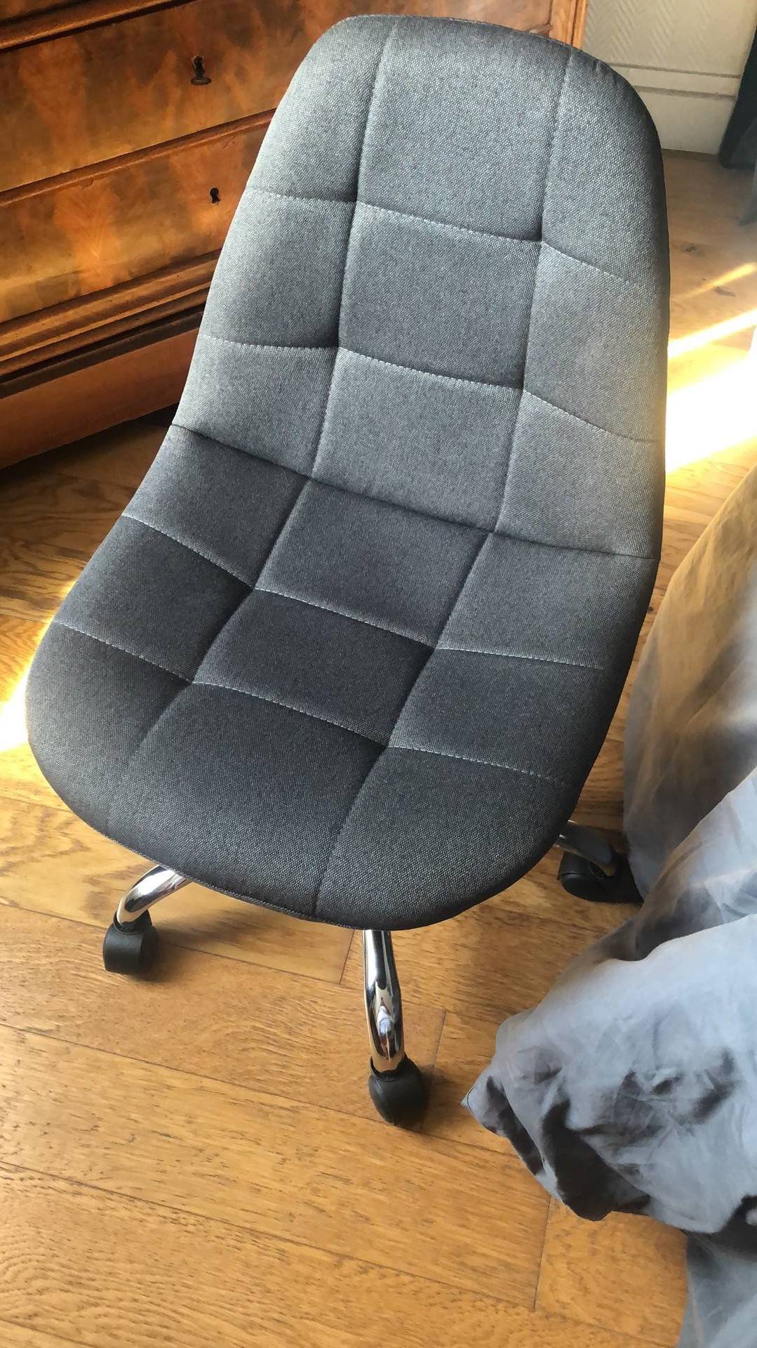 Chaise de bureau à roulettes en tissu gris foncé et acier chromé COX