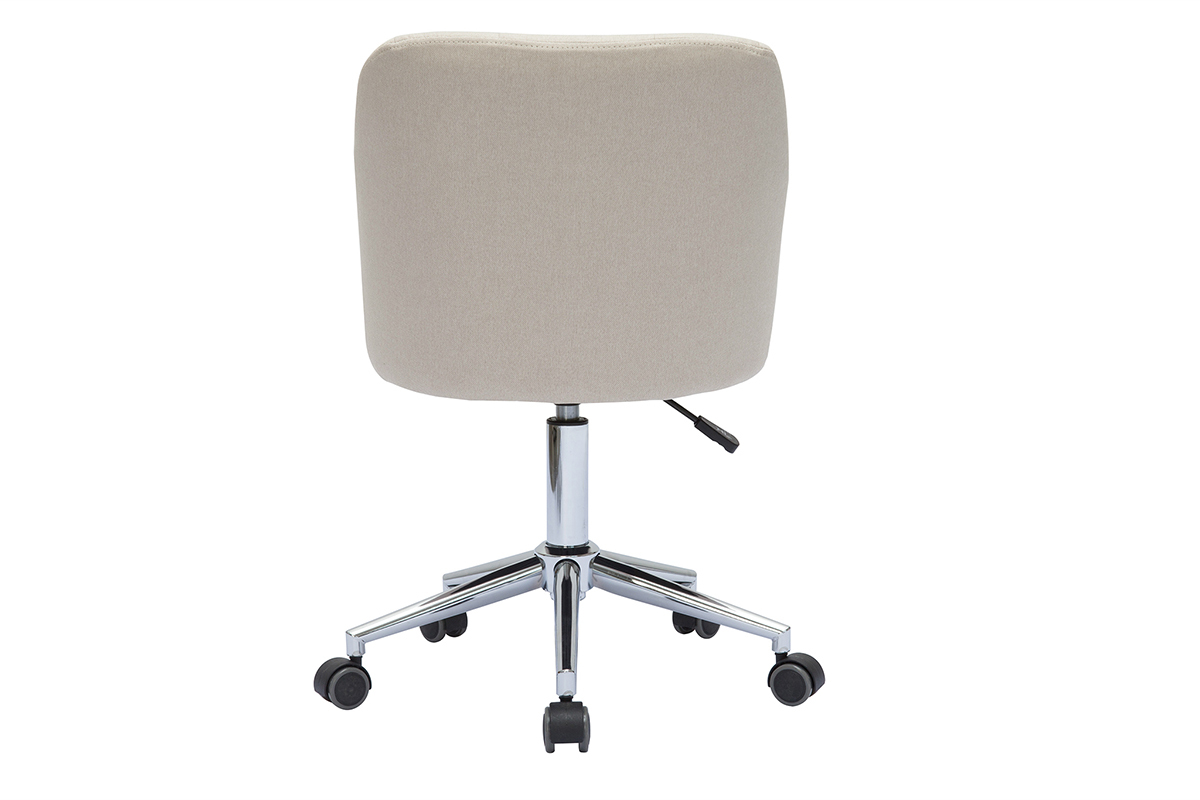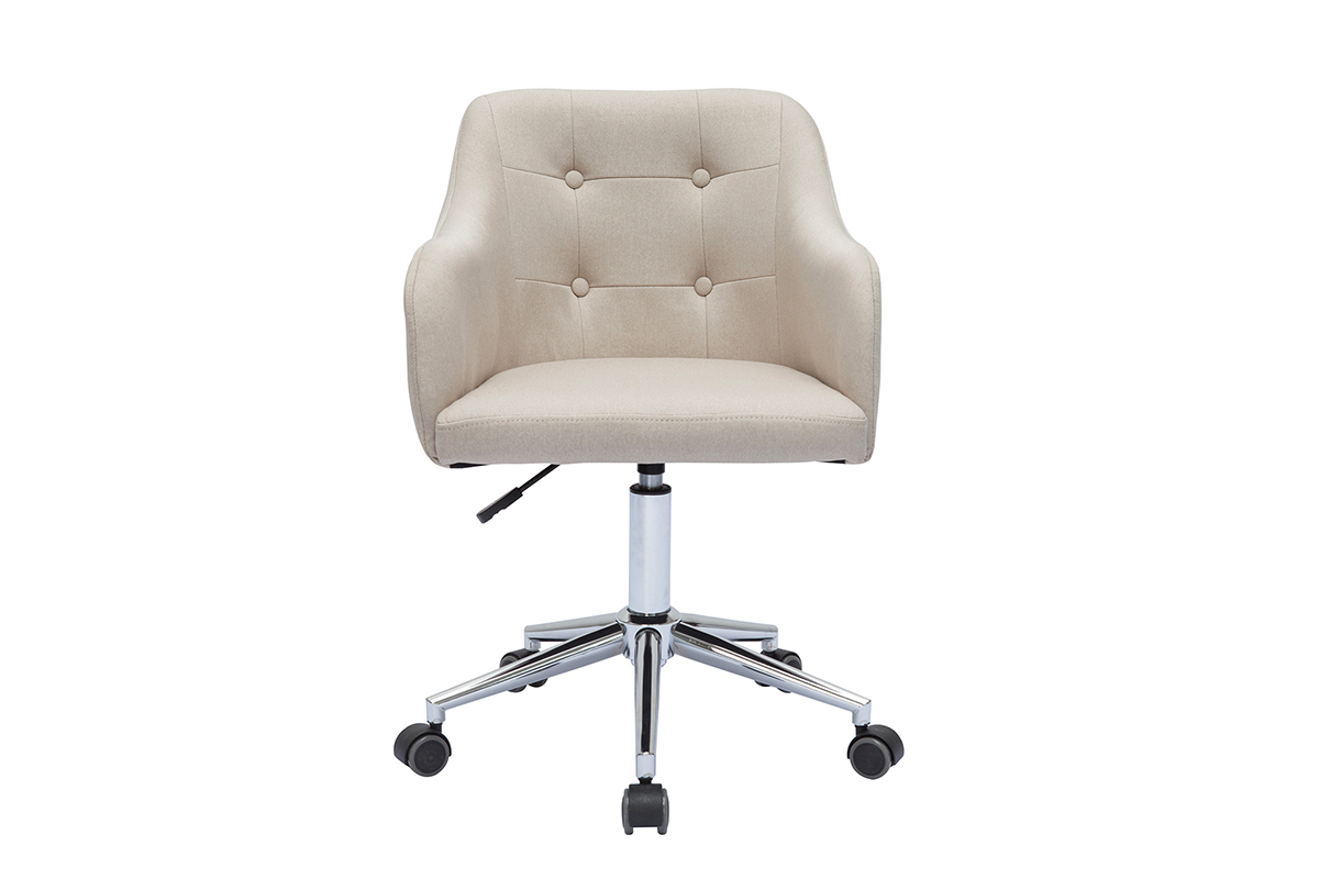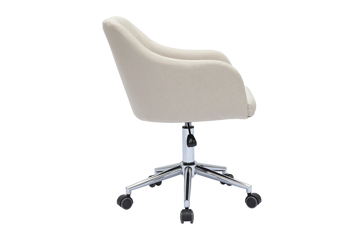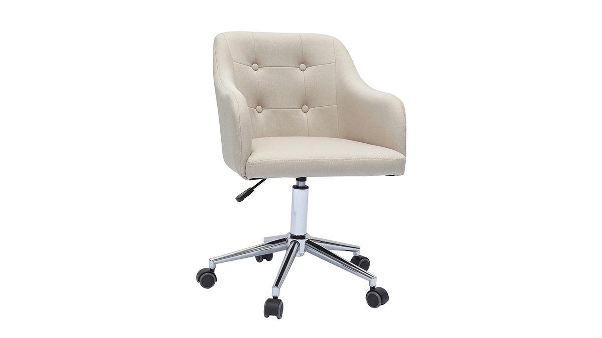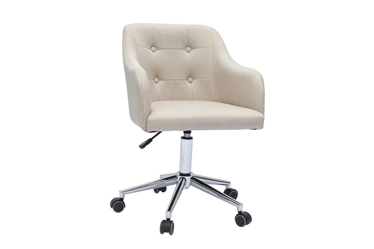 Son piètement en acier chromé associé à un revêtement en tissu beige fait de ce fauteuil de bureau un siège moderne et harmonieux. Ses finitions capitonnées lui apportent une touche élégante et raffinée pour un espace de travail plein de charme.