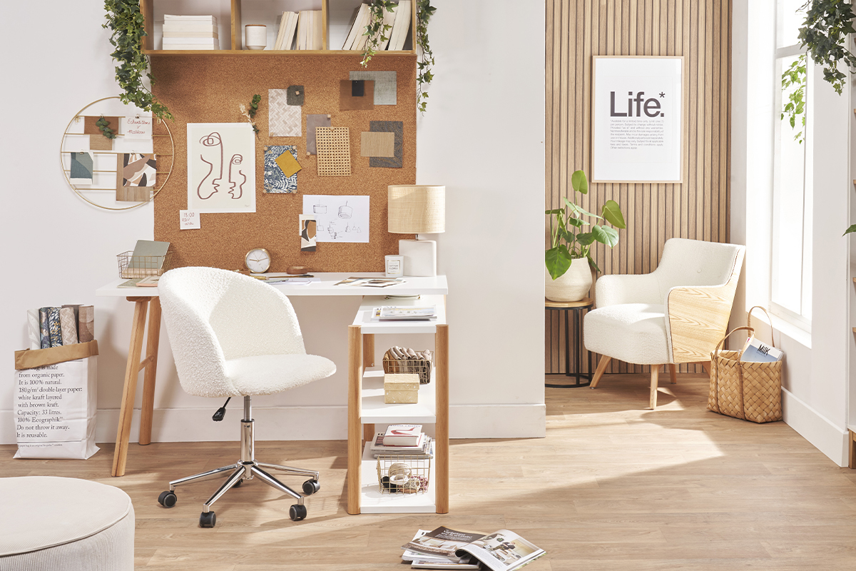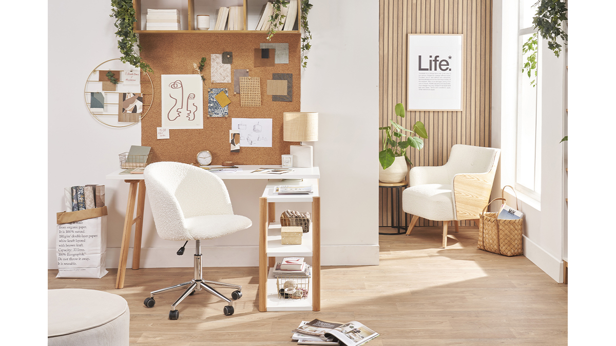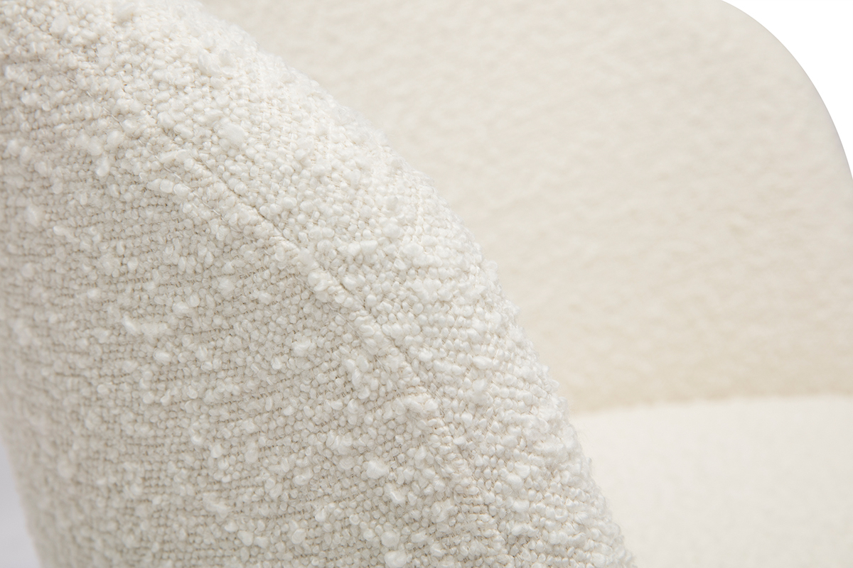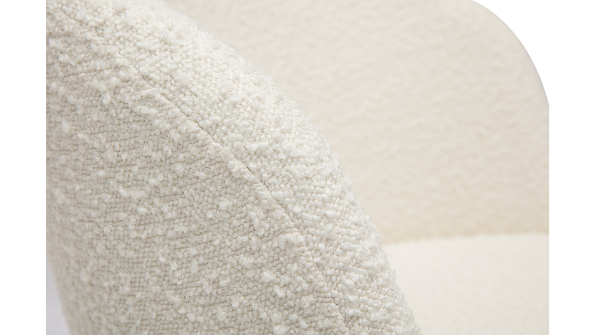 Avec son langage tout en rondeur et son rembourrage généreux (densité de la mousse 25 kg/m3), ce fauteuil de bureau design offre un excellent confort d'assise. Le dossier forme un véritable cocon, une enveloppe protectrice propice à la concentration et à la création. L'ensemble est recouvert d'un magnifique tissu effet laine bouclée (100% polyester) au toucher ultra doux.