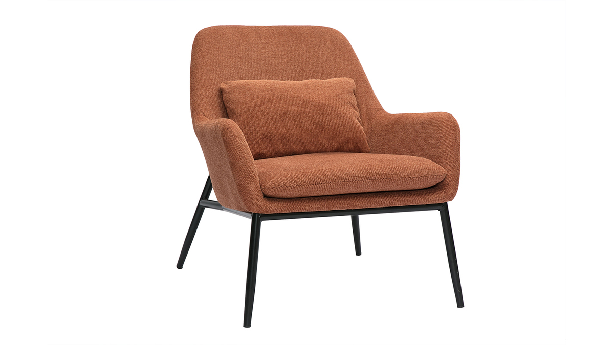 Tout a été pensé pour faire du fauteuil MAXINE un élément déco moderne et tendance. Sa belle ligne contemporaine est joliment mise en valeur par un revêtement en tissu effet velours terre brulée et des pieds en métal noir. Véritable pièce de déco, ce fauteuil design en tissu terre brulée et métal noir respecte parfaitement les envies des intérieurs dans l'air du temps. Teinte chaleureuse et silhouette tendance forment le combo gagnant !