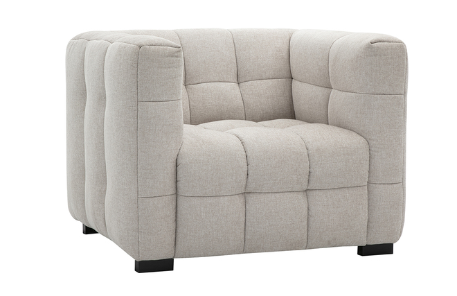 Sa forme cubique généreusement rembourrée avec des coutures capitonnées sur l’assise, le dossier et les accoudoirs lui donne un look à la fois contemporain et cosy. Ce style assumé en fait une pièce maîtresse qui trouve facilement sa place dans un salon moderne, un bureau raffiné ou même une chambre à coucher.