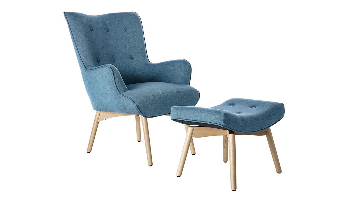 Avec son haut dossier, le fauteuil design scandinave et son repose-pieds bleu canard et bois clair BRISTOL sont des véritables atouts confort. Son haut dossier permet d'être tout à fait enveloppé par le fauteuil.