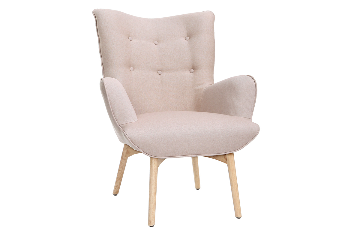 Ce fauteuil allie avec brio un style scandinave apporté par ses formes élégantes et ses jolis pieds en bois clair, et une touche vintage par son rose doux. Ses capitons ajoutent la touche finale, pour un joli relief et un bon maintien du dossier.