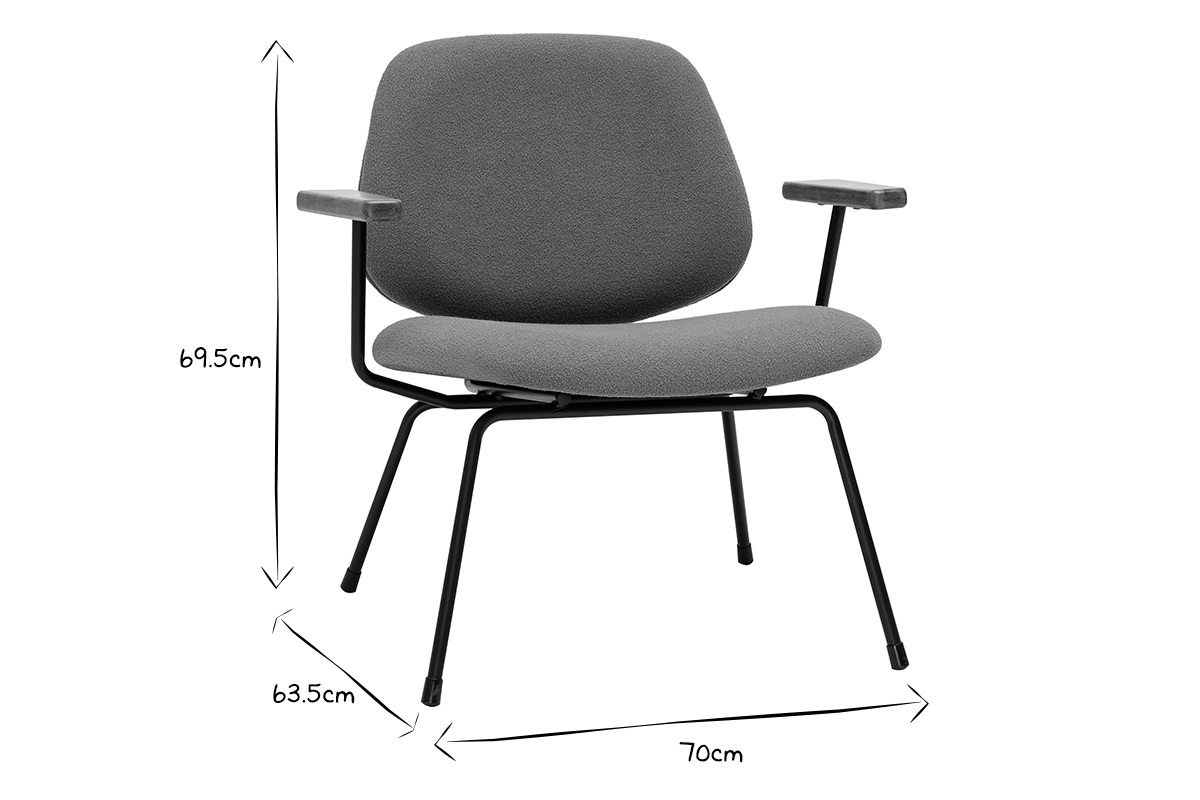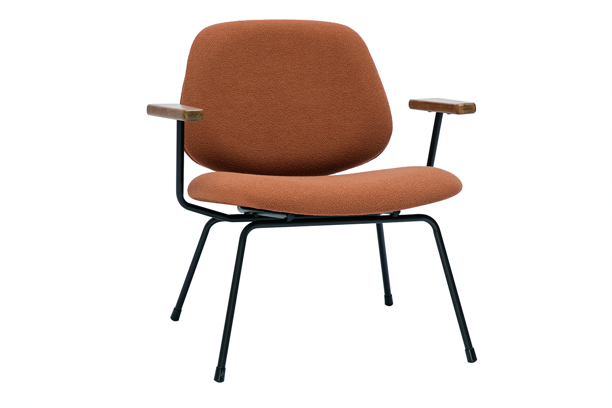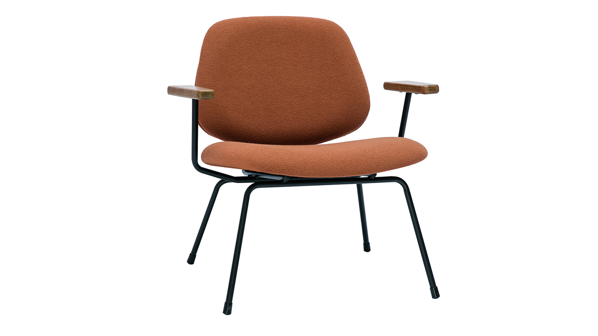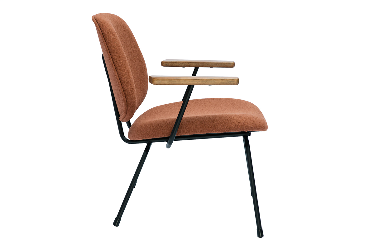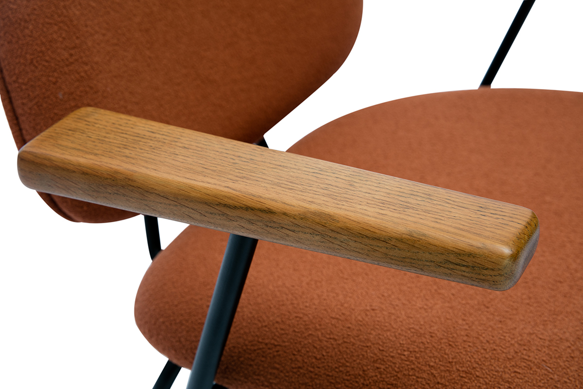 Le fauteuil BARNET séduit par son approche stylistique à la croisée des univers - entre inspirations art-déco, rétro et contemporaine. Agréable à l'oeil sous toutes ses coutures, ce fauteuil design fait preuve d'une belle texturisation. L'intense revêtement en tissu effet laine bouclée terre brûlée s'accorde à la perfection au chêne massif teinté noyer des accoudoirs. Quant à la structure en métal noir, elle contraste parfaitement avec le tissu et le bois tout en soulignant la silhouette moderne de ce fauteuil tendance.