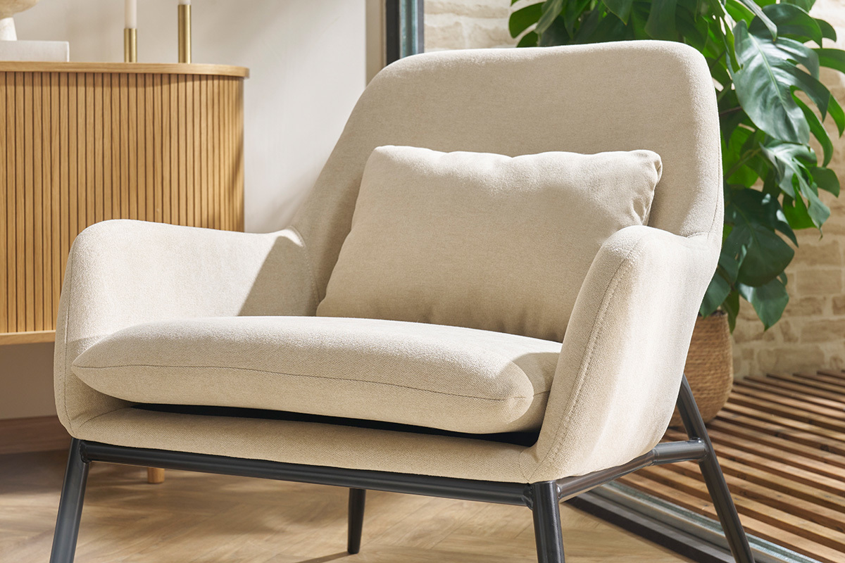 Avec sa forme englobante, son petit coussin d'appoint et son rembourrage généreux (densité assise et dossier : 25 kg/m³ - épaisseur d'assise 2 cm), ce grand fauteuil moderne (L67.5 x P77.5 x H75 cm) offre un véritable confort.