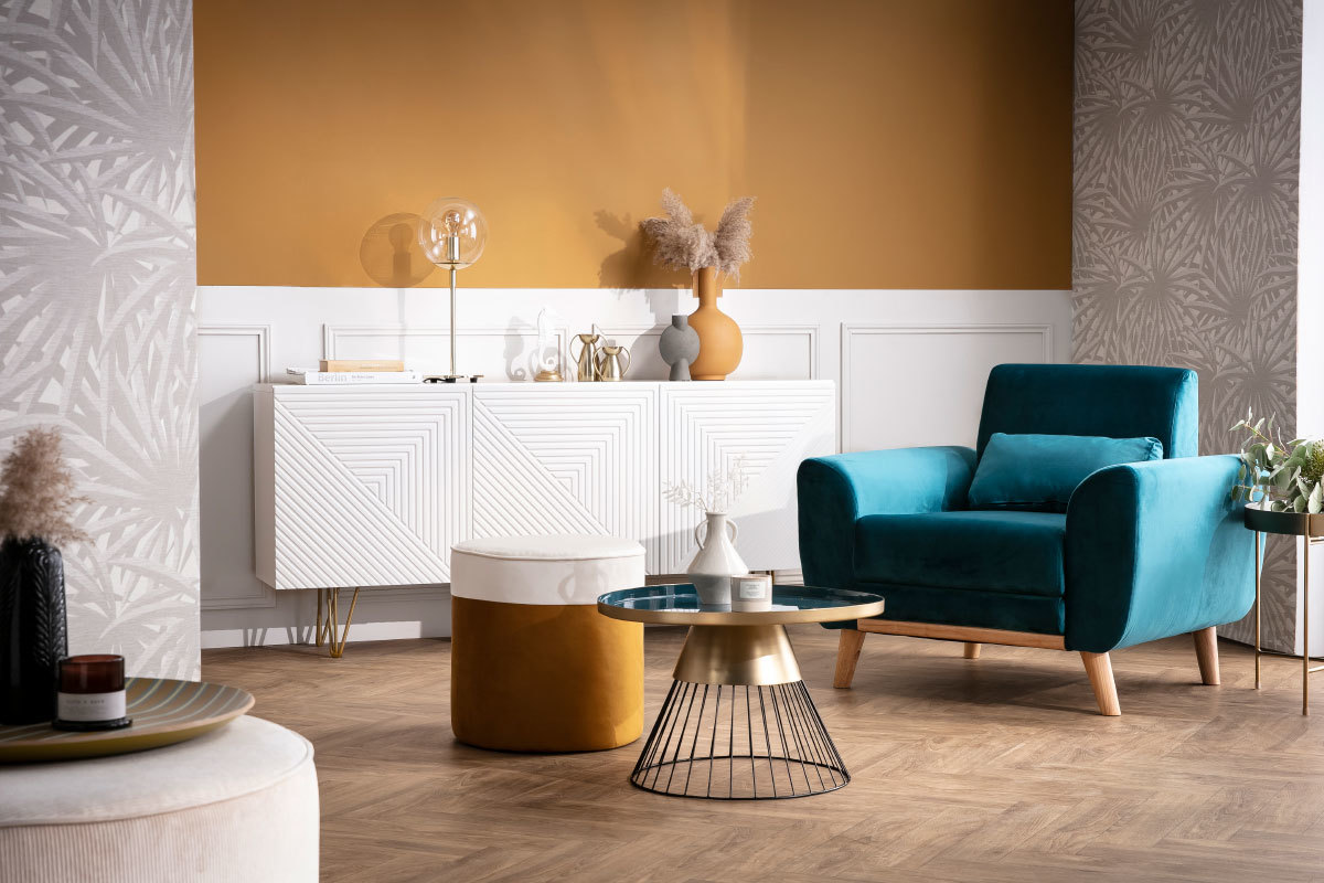 Pour un salon sophistiqué, on accompagne ce fauteuil bleu pétrole d'une table d'appoint tendance, en laiton ou marbre.