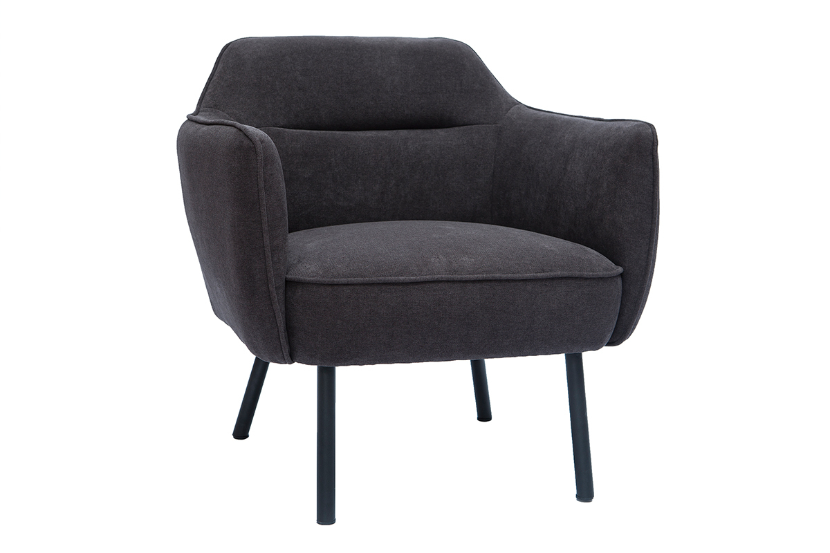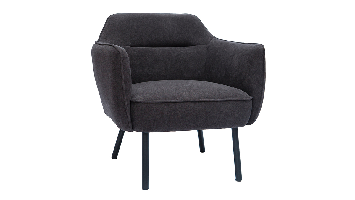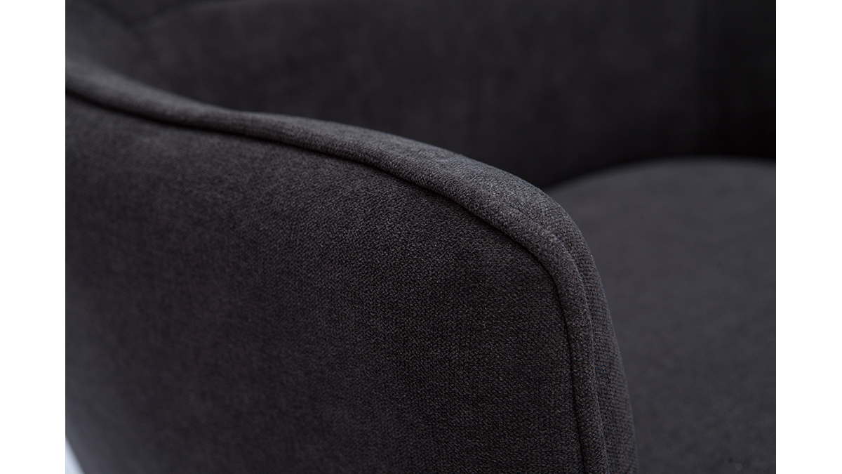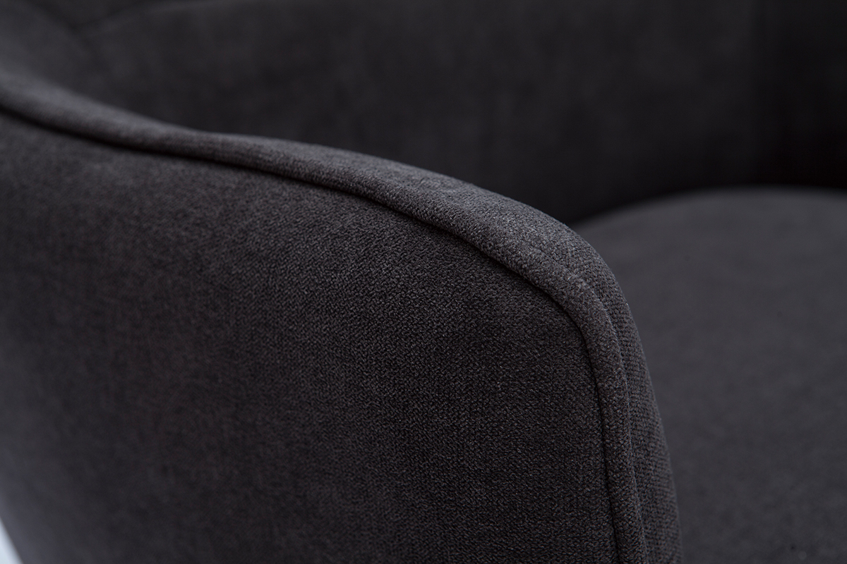 Ce fauteuil au look couture se distingue par son magnifique tissu effet velours gris foncé dont le velouté sollicite l'oeil autant que la main. L'élégant passepoil ton sur ton qui sculpte le tissu lui confère une élégance folle. On aime aussi le contraste avec ses pieds fins et fuselés en métal noir qui apportent une grande légèreté visuelle.
