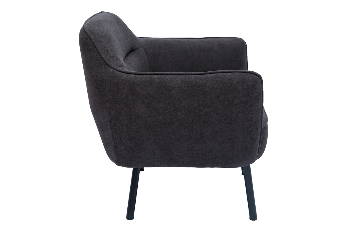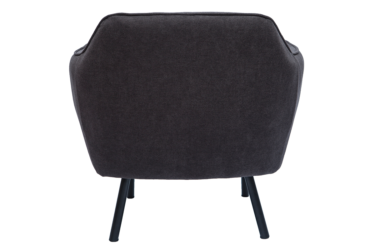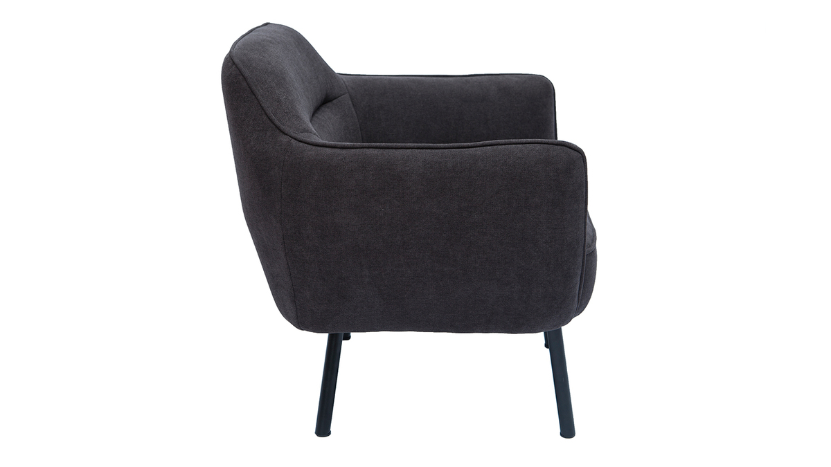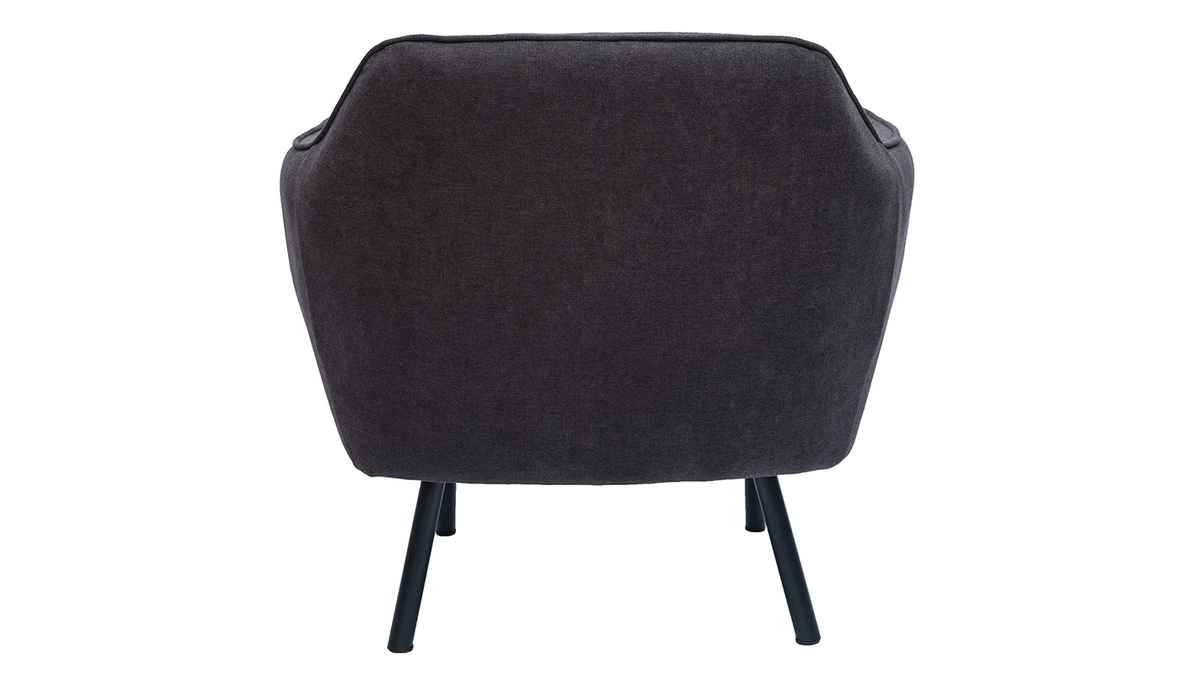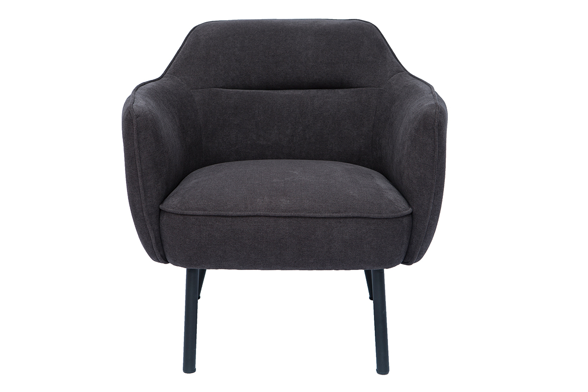 Ce fauteuil au look couture se distingue par son magnifique tissu effet velours gris foncé dont le velouté sollicite l'oeil autant que la main. L'élégant passepoil ton sur ton qui sculpte le tissu lui confère une élégance folle. On aime aussi le contraste avec ses pieds fins et fuselés en métal noir qui apportent une grande légèreté visuelle.