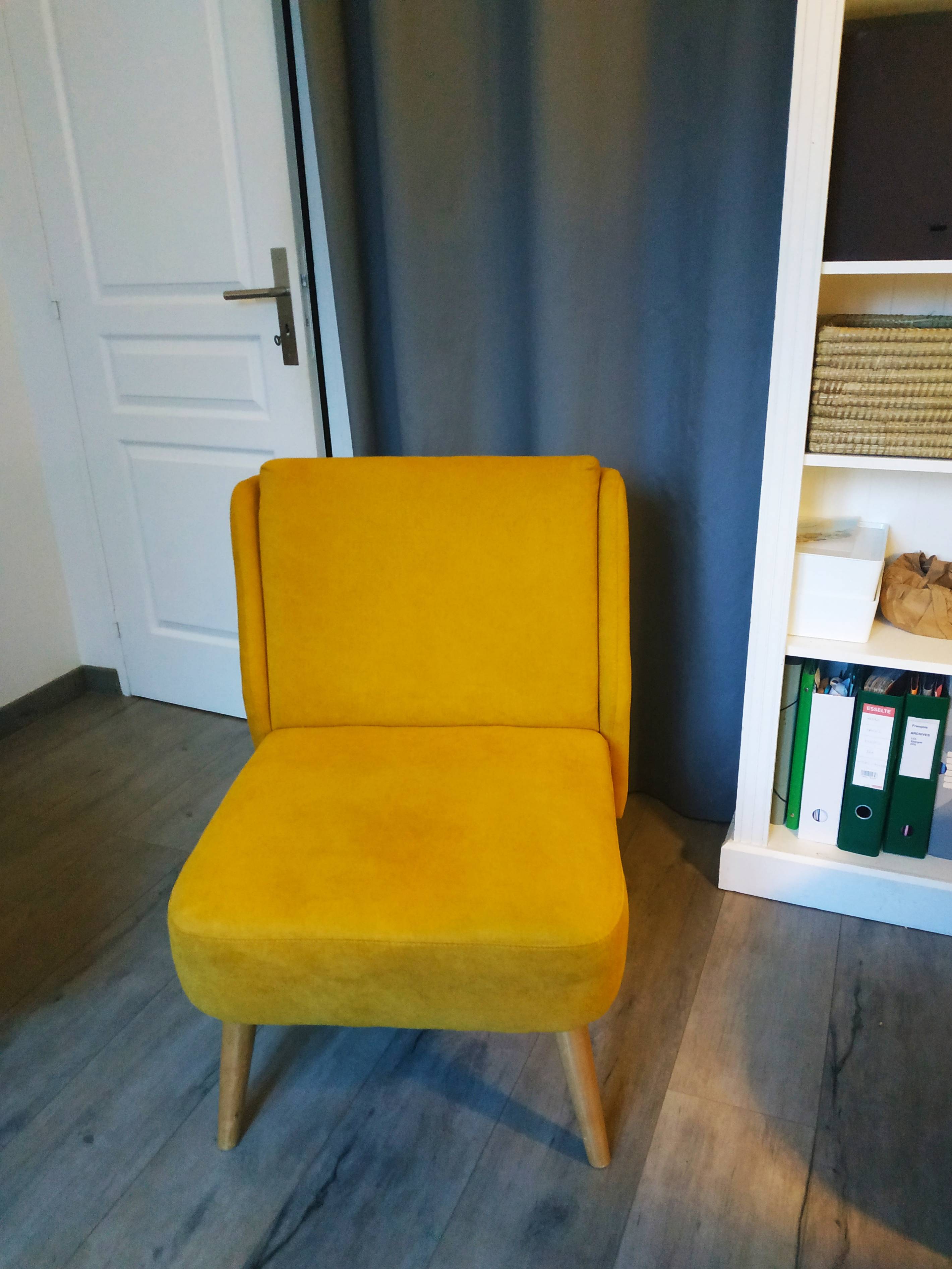 Fauteuil scandinave en tissu effet velours jaune moutarde et bois clair AEOLA