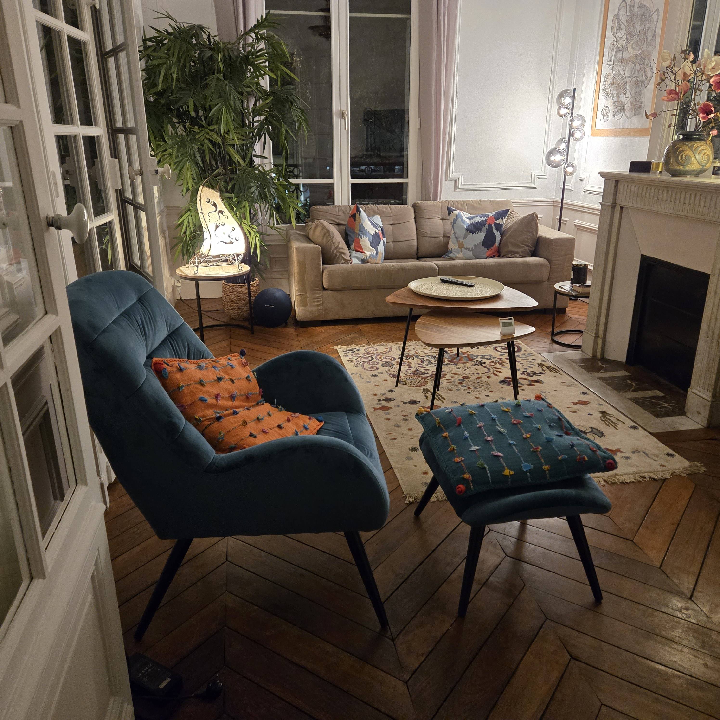 On s'aménage l'espace détente de nos rêves en accompagnant cet ensemble fauteuil et repose-pieds d'une petite table d'appoint design.