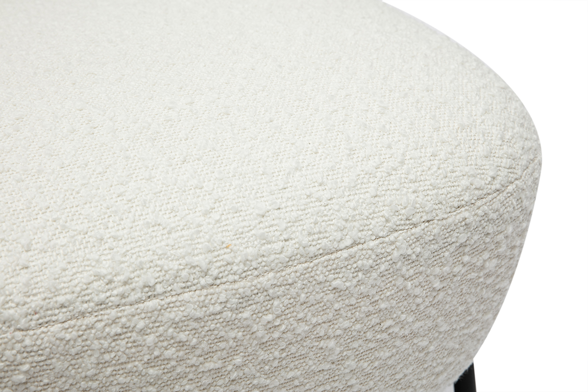 Non sans rappeler la forme d'un douillet cocon, dossier et assise, garnis d'une agréable mousse, forment en une seule pièce un siège accueillant et tout confort. L'ensemble habillé d'un revêtement en tissu effet laine bouclée blanc contraste élégamment avec l'aérien piètement en métal noir. Voilà un fauteuil rond et enveloppant que vous ne voudrez plus quitter !