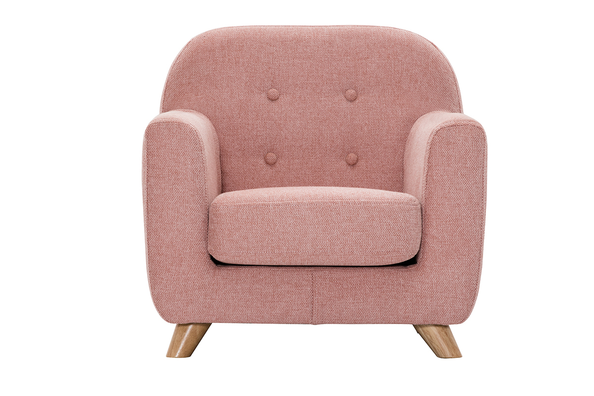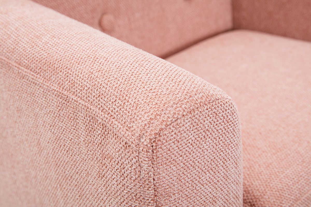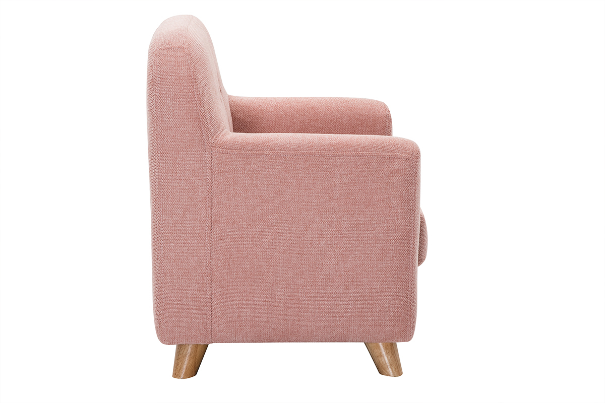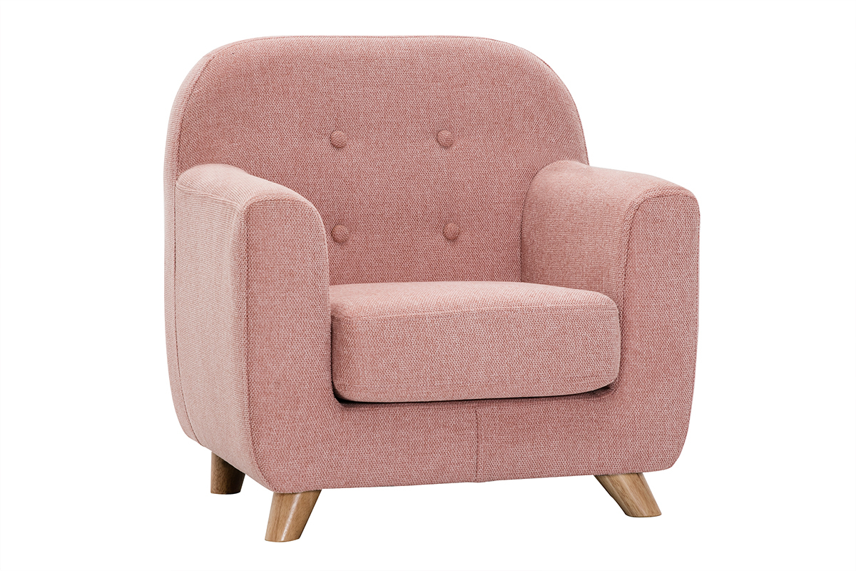 Fauteuil enfant scandinave en tissu effet velours texturé rose et bois clair NORKID livré prêt à assembler. Montage simple, seuls les pieds sont à fixer.
