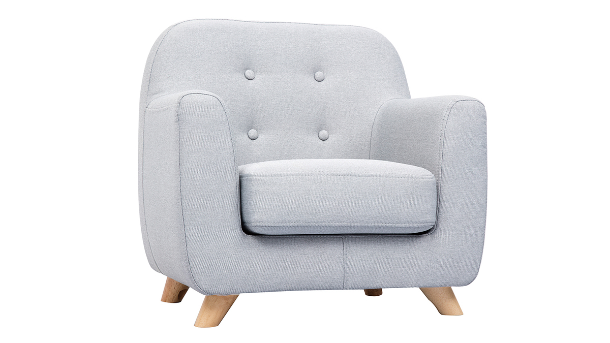Fauteuil enfant scandinave en tissu gris clair et bois clair NORKID livré prêt à assembler. Montage simple, seuls les pieds sont à fixer.