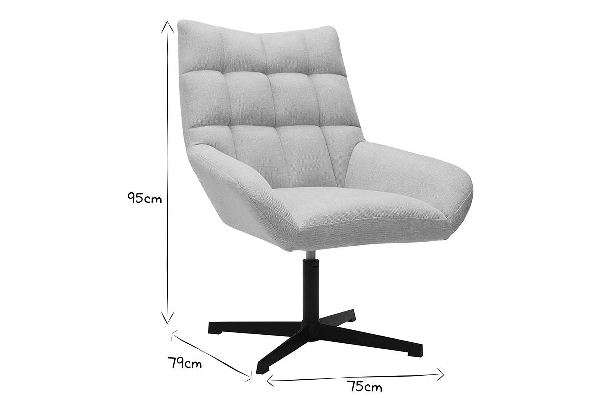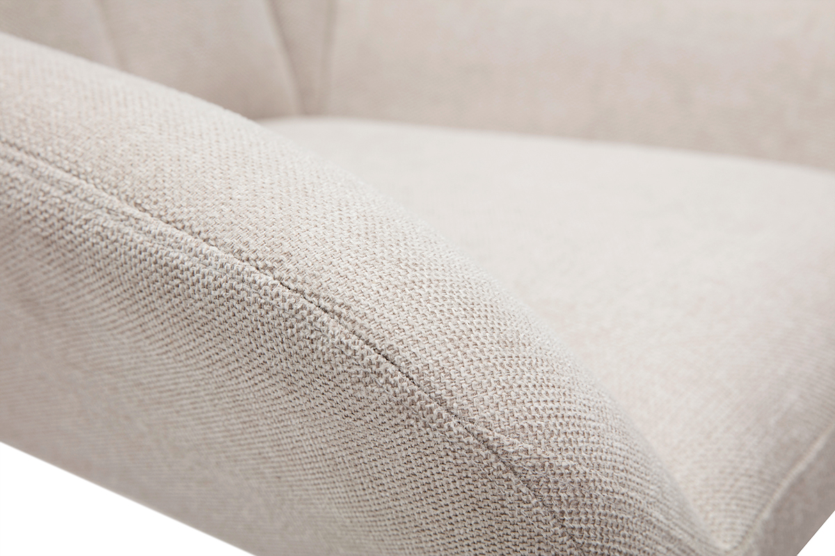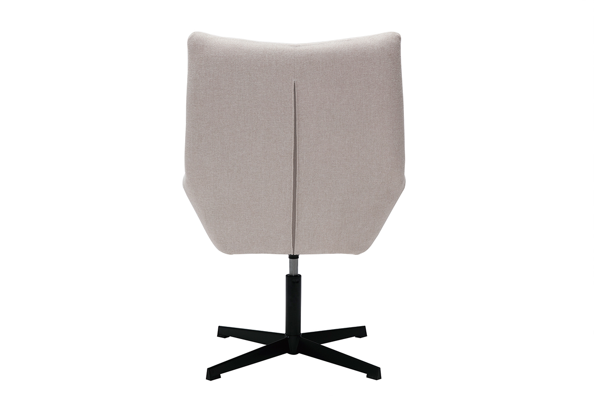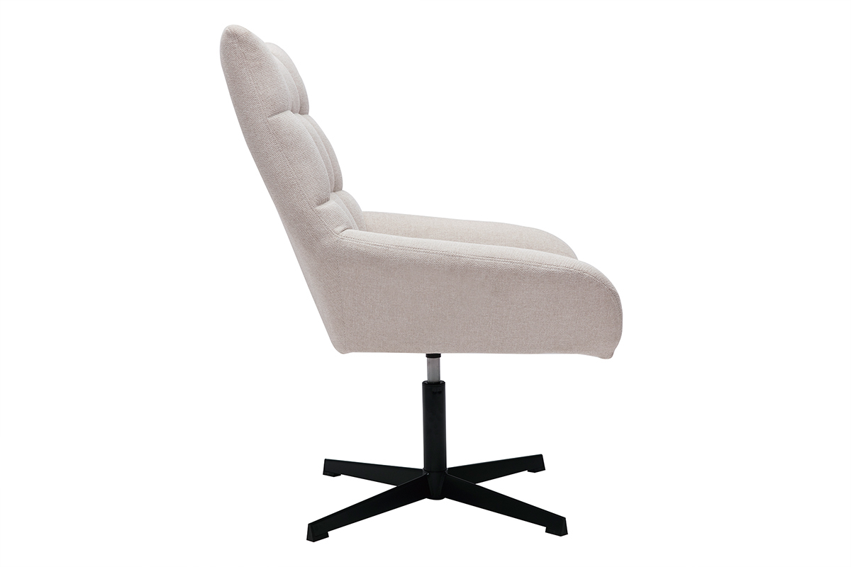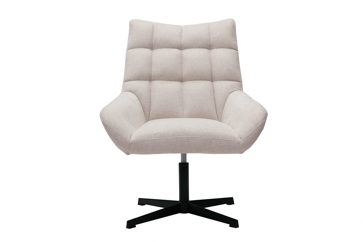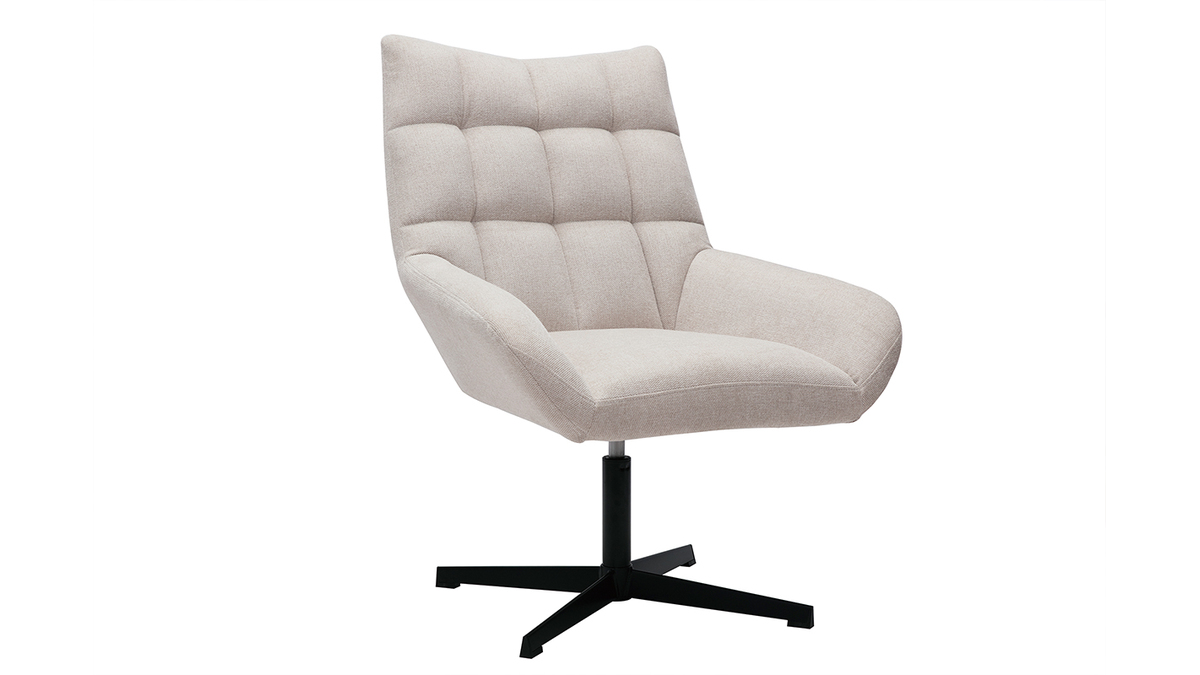 Harmonieux mélange d'un revêtement en tissu effet velours texturé beige et d'un piétement en métal noir, ce fauteuil pivotant cultive un esprit raffiné et cosy. Sa silhouette volumineuse invite à la détente et promet un maximum de confort. Son grand dossier matelassé apporte tout le soutien nécessaire tout en donnant à l'ensemble un aspect douillet. Chic et confortable, ce fauteuil contemporain deviendra la pièce maîtresse du salon.