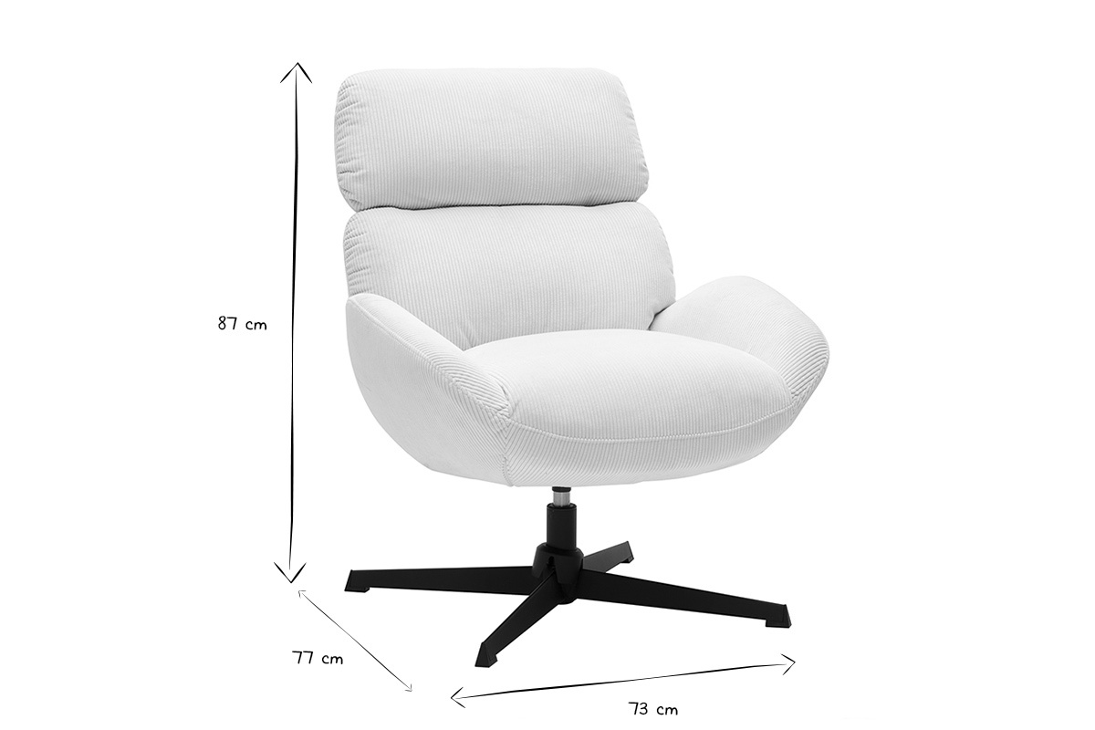 Ce fauteuil écru repose sur un piétement étoile en métal noir, à la fois robuste et épuré. Sa structure pivotante à 360° vous offre une grande liberté de mouvement au quotidien, renforçant sa praticité sans nuire à son design. Que vous l’utilisiez comme fauteuil d’appoint ou comme pièce maîtresse de votre coin lecture, il saura s’adapter à tous les styles d’intérieurs, du contemporain au scandinave, en passant par le rétro-chic.