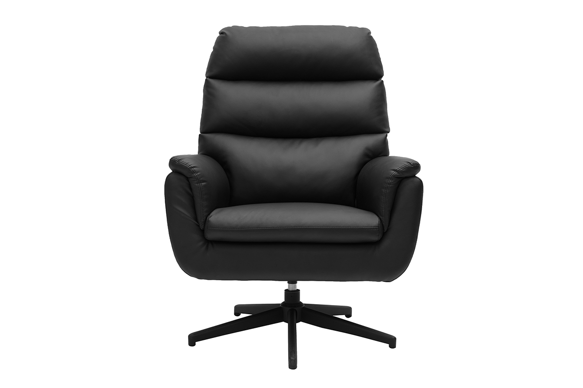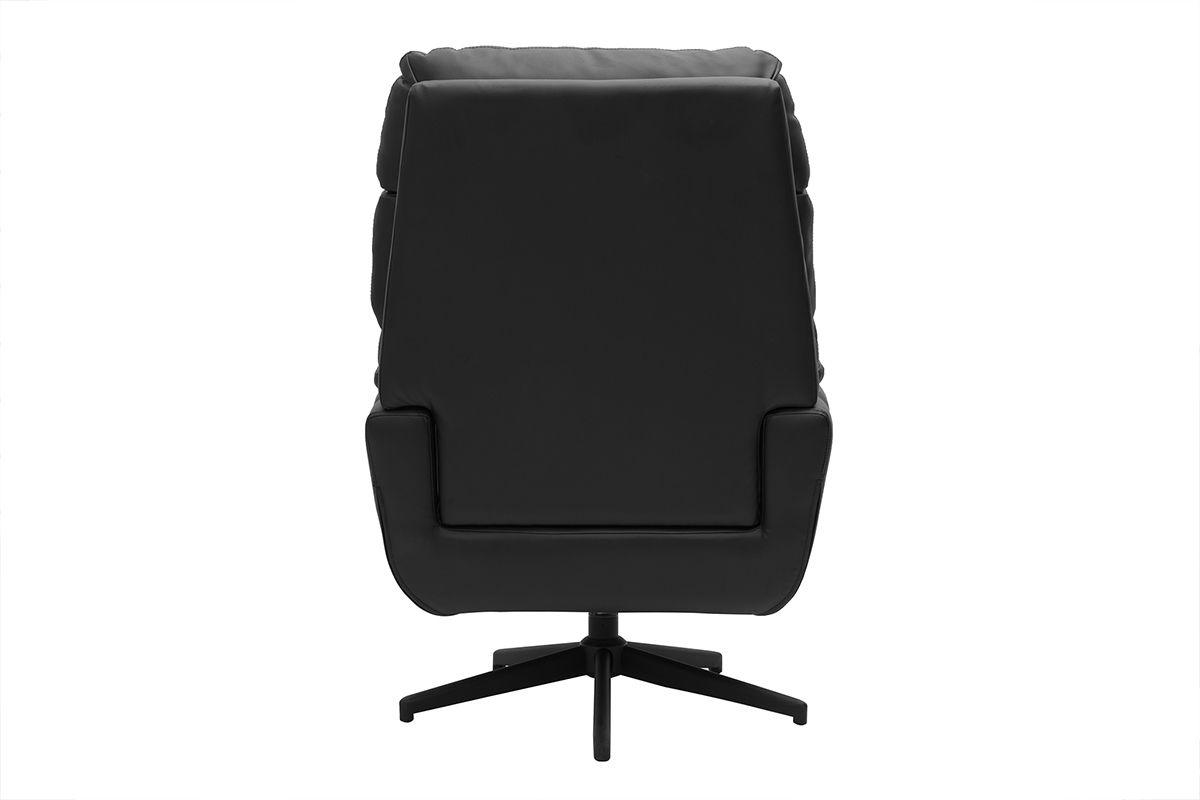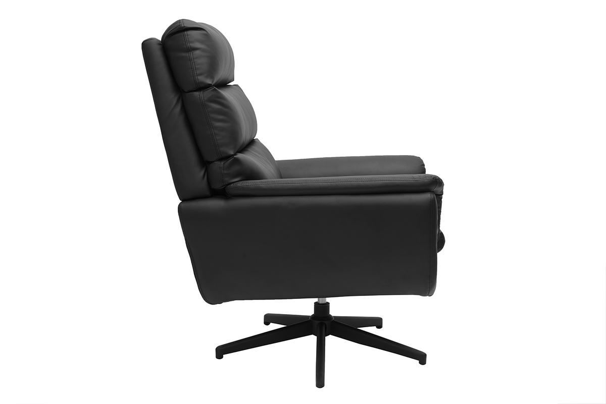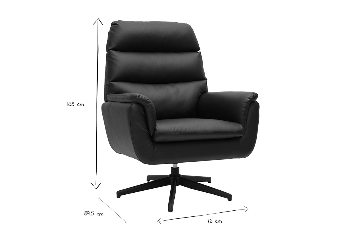 Ce fauteuil noir repose sur une base pivotante à 360°, réalisée en métal noir mat, assurant robustesse et stabilité tout en permettant une rotation fluide. Ce détail fonctionnel le rend idéal pour un coin lecture, un espace de détente ou même un bureau, où il s'adapte aisément aux mouvements et aux besoins de son utilisateur.
