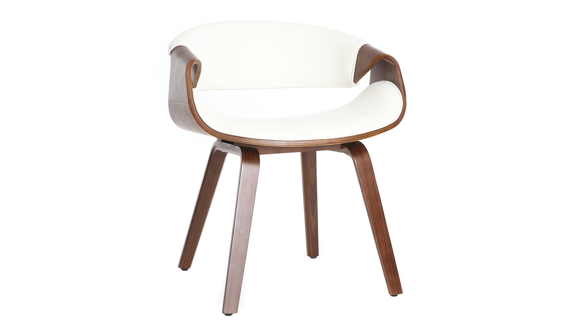 L'association du bois plié placage noyer et du polyuréthane blanc apporte de beaux contrastes et permet de mettre autant en valeur le bois que le revêtement moderne. Ses accoudoirs recourbés, ses courbes arrondies et épurées rappellent également le style des années 70. Un joli mélange entre vintage et scandinave.